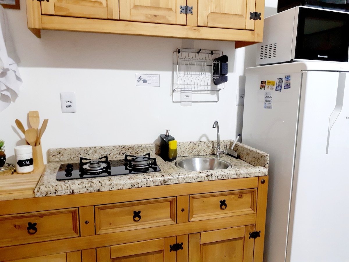 Desfrute de uma estadia confortável neste apartamento completo, ideal para estadias curtas. O espaço conta com: - Quarto com cama de casal, ar-condicionado e mesa de escritório. - Cozinha equipada com geladeira, fogão, utensílios básicos e alguns condimentos (sal, açúcar, café..). - Sala de estar com sofá e TV. - Banheiro com chuveiro elétrico e secador de cabelos. Além disso, o imóvel oferece: - Estacionamento descoberto com portão eletrônico e câmeras de segurança . - Lavanderia compartilhada.