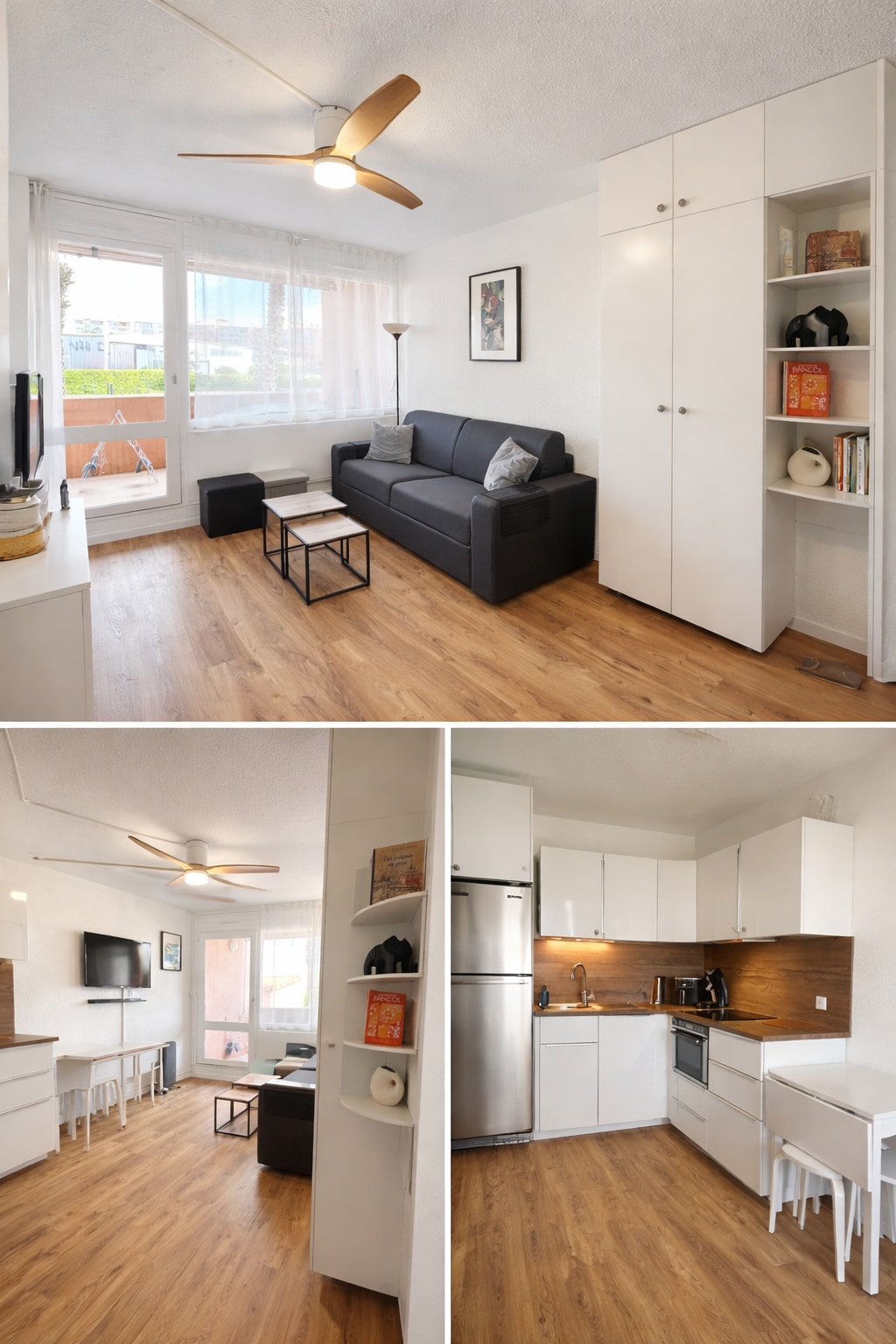 In het hart van het NATURISTENDORP Goed uitgerust, comfortabel 38m2 appartement, kwantiteit borden en kwaliteit. Wifi, tv, miniketting, kluis, vaatwasser, wasmachine op de tweede verdieping lift, expo IS dubbele beglazing geluidsisolatie en thermische isolatie. Slaapbedflap 140 X 190 . Strand 100 m winkelcentrum, Voorzijde Jardin D'EDEN, GLAMOUR, uitzicht op zee Beveiligd gebouw. Eigen beveiligde parkeerplaats Beddengoed aanwezig, behalve strandlinnen