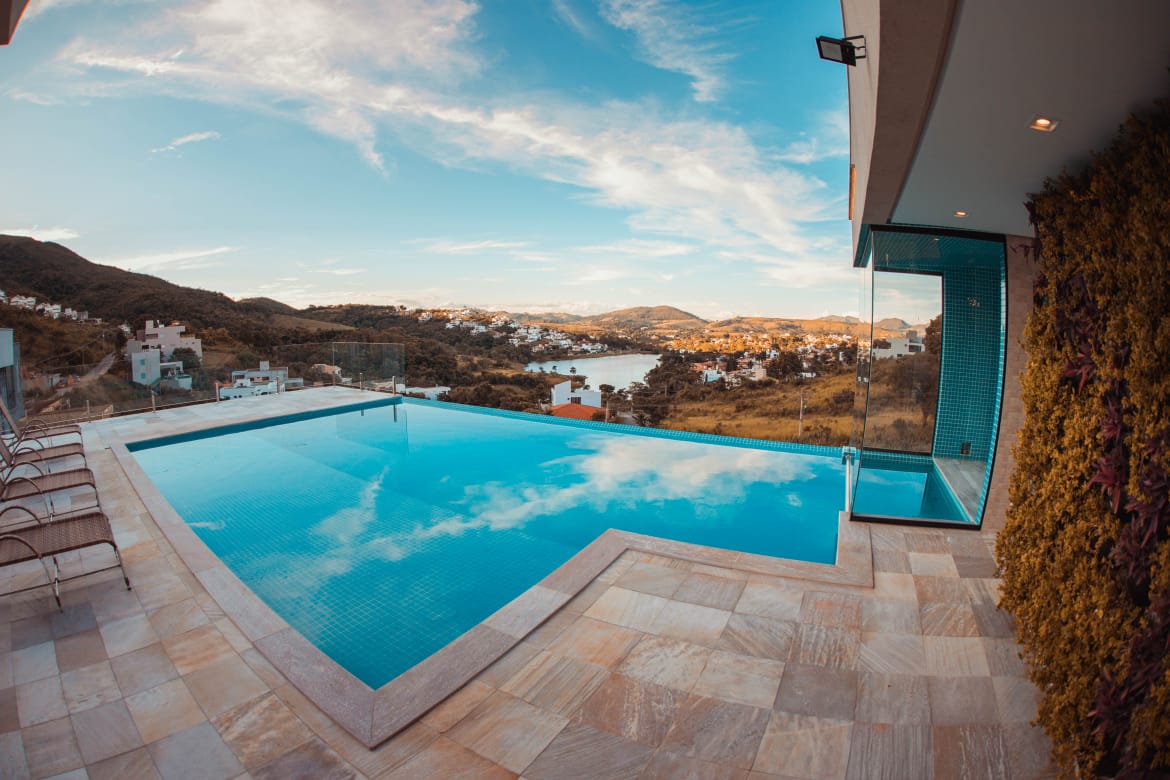 Casa em Capitólio Escarpas do Lagoon met uitzicht op de lagune - 4 suites , 2 semi-uites, is geschikt voor maximaal 20 personen, wifi, spa, verwarmd zwembad, sauna, barbecue, speelkamer, mini-basketbalbox, terras met oneindig uitzicht, ligstoelen. Drie suites met airconditioning, andere suites met een balkon en een plafond ventilator. Uitzicht op het meer, Hydro en openhaard. Er zijn twee kamers met Smart TV, open haard en balkon met hangmatten. Keuken met keukengerei. Bierbarbecue en zwembad