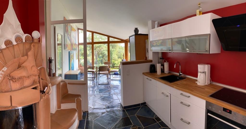 Das Ferienhaus liegt am Rande einer bewaldeten privaten Wochenendsiedlung. Es ist großzügig geschnitten, hell, modern eingerichtet und sehr gut ausgestattet. Paradiesisch ist es dort zu jeder Jahreszeit & perfekt für eine kurze oder längere Auszeit in der Idylle! The house is located on the edge of a wooded private weekend village. It is spacious, modern and very well equipped. It is paradisiacal there in all seasons & perfect for a shorter or longer break in the idyll