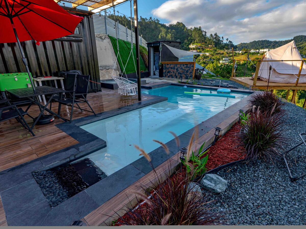 Gelegen in een grote ruimte in de messen van de Moca buurt, P.R. waar je kunt genieten van een droom verlicht uitzicht, zowel overdag als 's nachts. Je zult loskoppelen van het gebruikelijke en in contact komen met je innerlijke zelf, natuur, vogels, lucht en frisse lucht. Je neemt een onvergetelijke visuele ervaring mee. Een ideaal concept voor koppels(privé en veilig), hoewel maximaal twee personen zijn toegestaan ( 4 in totaal) Zwembad 🏊♂️ met waterval, jacuzzi en verwarming.