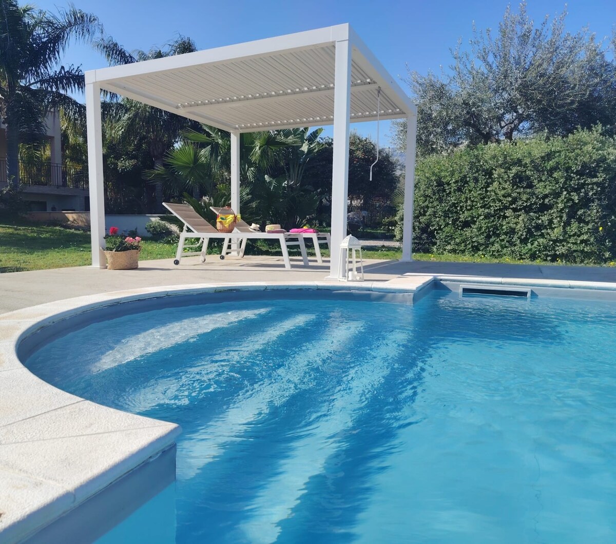Omgeven door tuinen, sierlijke planten en eeuwenoude olijfbomen, heeft de villa veel buitenruimte. Het biedt de gast de mogelijkheid om momenten van intense ontspanning door te brengen. Exclusieve voorzieningen zoals een ultramodern ondergronds zwembad met zoutelektrolysisysteem, dag en nacht geopend. Dicht bij de luchthaven van Palermo, op een paar minuten rijden van de zee, ligt het op een ideale locatie om de prachtige toeristische bestemmingen van ons Sicilië te bereiken. Gratis Ultra-Swet WiFi