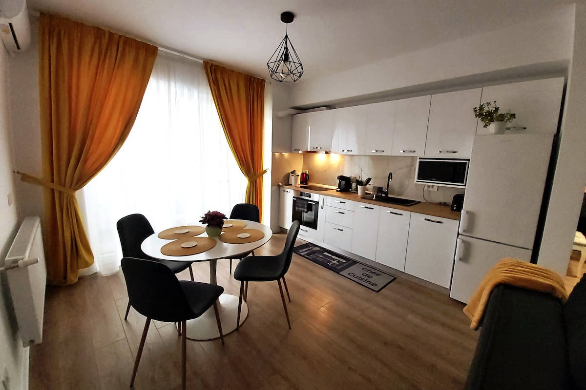 Deze centraal gelegen woning in Militari Residence is smaakvol ingericht. Dit appartement beschikt over de volgende voorzieningen: Eigen parkeerplaats met slagboom Muren ingericht met Stucco Veneziano 4K smart-tv met Netflix en airconditioning Het complex biedt: binnen- en buitenzwembaden, natte en droge sauna's, jacuzzi en een fitnesscentrum. De afstand tot het wellnesscentrum is 500 m, en tot Aqua Garden is het 550 m, ongeveer 7 minuten lopen. De prijs voor toegang tot het zwembad is 70 RON per persoon.