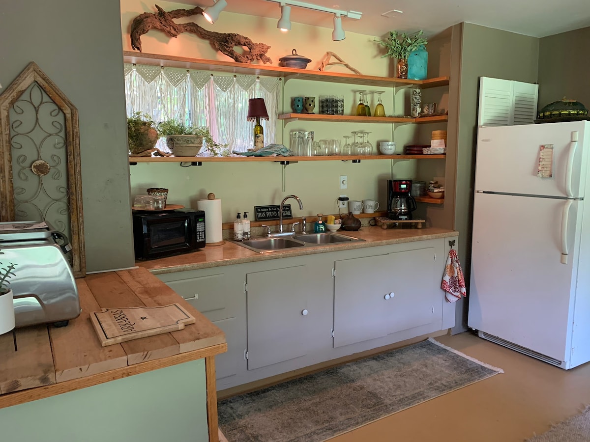 Ontkoppel je van de wereld en geniet van een uitje aan de rivier!!!!! Comfortabele inrichting en mooi kingsize bed om te kunnen ontspannen! Koffiezetapparaat en alle benodigdheden in de keuken voor je maaltijden aan het meer!! Loop naar het water voor een duik , vissen of te varen. Down town eureka springs 12 minuten van het huisje. Dit huisje is alleen voor 2 volwassenen!! Er zijn onder geen enkele omstandigheid dieren toegestaan voor gezondheid en veiligheid, ernstige allergieën en veiligheid van scharrelkippen op het terrein.