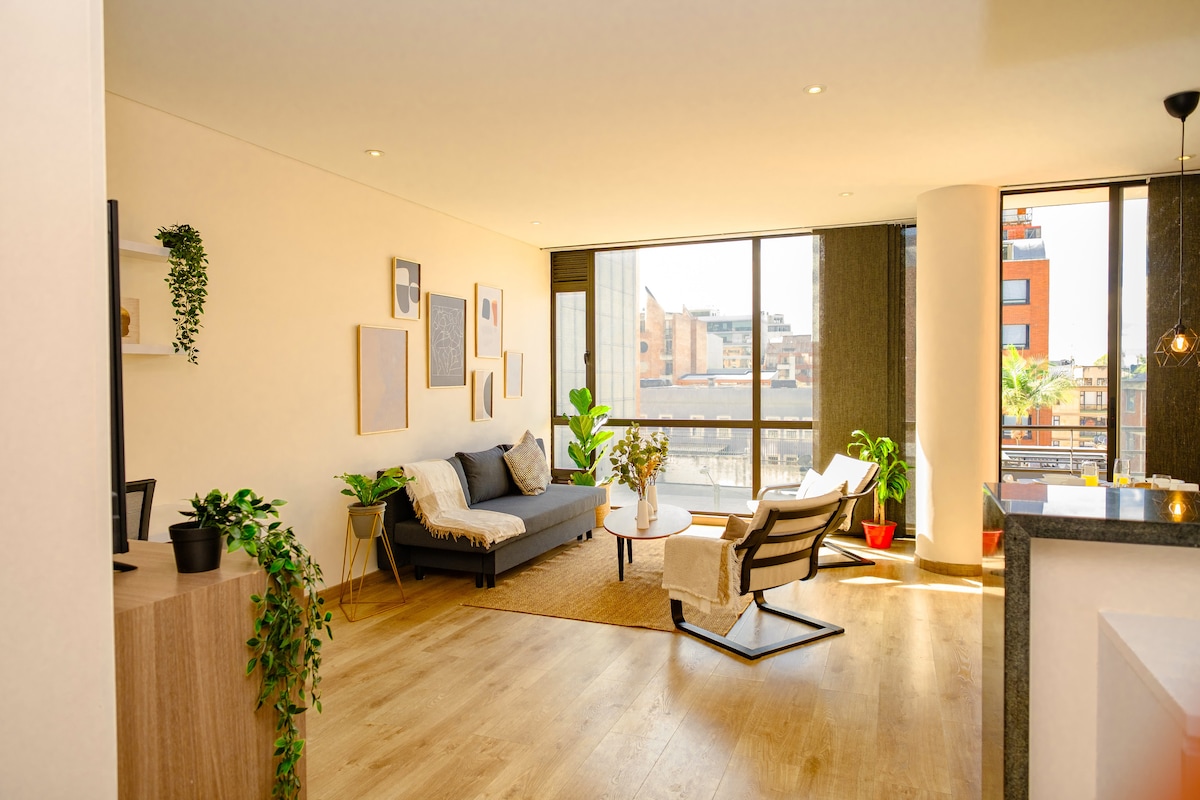 Modern appartement met 2 slaapkamers en 2 badkamers in het noorden van Bogotá, op 10 minuten van Zone T en dicht bij Parque El Virrey. Hoofdkamer met kingsize bed en eigen badkamer. Eigen patio met jacuzzi en BBQ. Uitgeruste volledige keuken, was- en droogtoren, studieruimte en grote sociale ruimte met woonkamer, eetkamer en leesruimte. Ideaal om tot rust te komen of in stijl te werken! 🛜 WIFI 🍳Keuken 🧖♂️ Bubbelbad 🫕Barbecue.