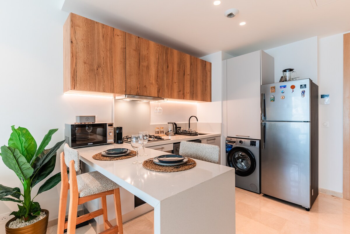 Stijlvol appartement van 70 m2 in het hart van de chique wijk Casa Finance City, met een spectaculair uitzicht op de kleine palmboomgaard. Deze moderne ruimte heeft een slaapkamer met een premium matras en een eigen kleedkamer, een ruime woonkamer, een keuken met luxe apparatuur en een verfijnde badkamer. Ideaal voor zakenreizigers of vriendengroepen. Gelegen boven het winkelcentrum Aerea, met eigen parkeerplaats en op 1 minuut van de tram. Reserveer voor een unieke ervaring!