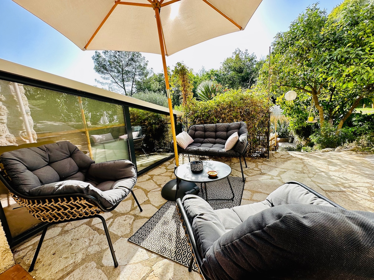 Petit STUDIO très bien équipée avec entrée et parking privé dans une grande Propriété avec piscine et jacuzzi chauffés du 10 avril au 30 octobre . La piscine extérieur et jacuzzi ainsi que le jardin sont partagés mais assez grand pour profiter chacun son espace de tranquillité . Je vis dans la bastide principale . Un Havre de Paix entouré d oliviers centenaires . A 35 minutes de l aéroport de Nice et divers villages provençaux et 14km de Cannes . Tele grand écran /abonnement Netflix