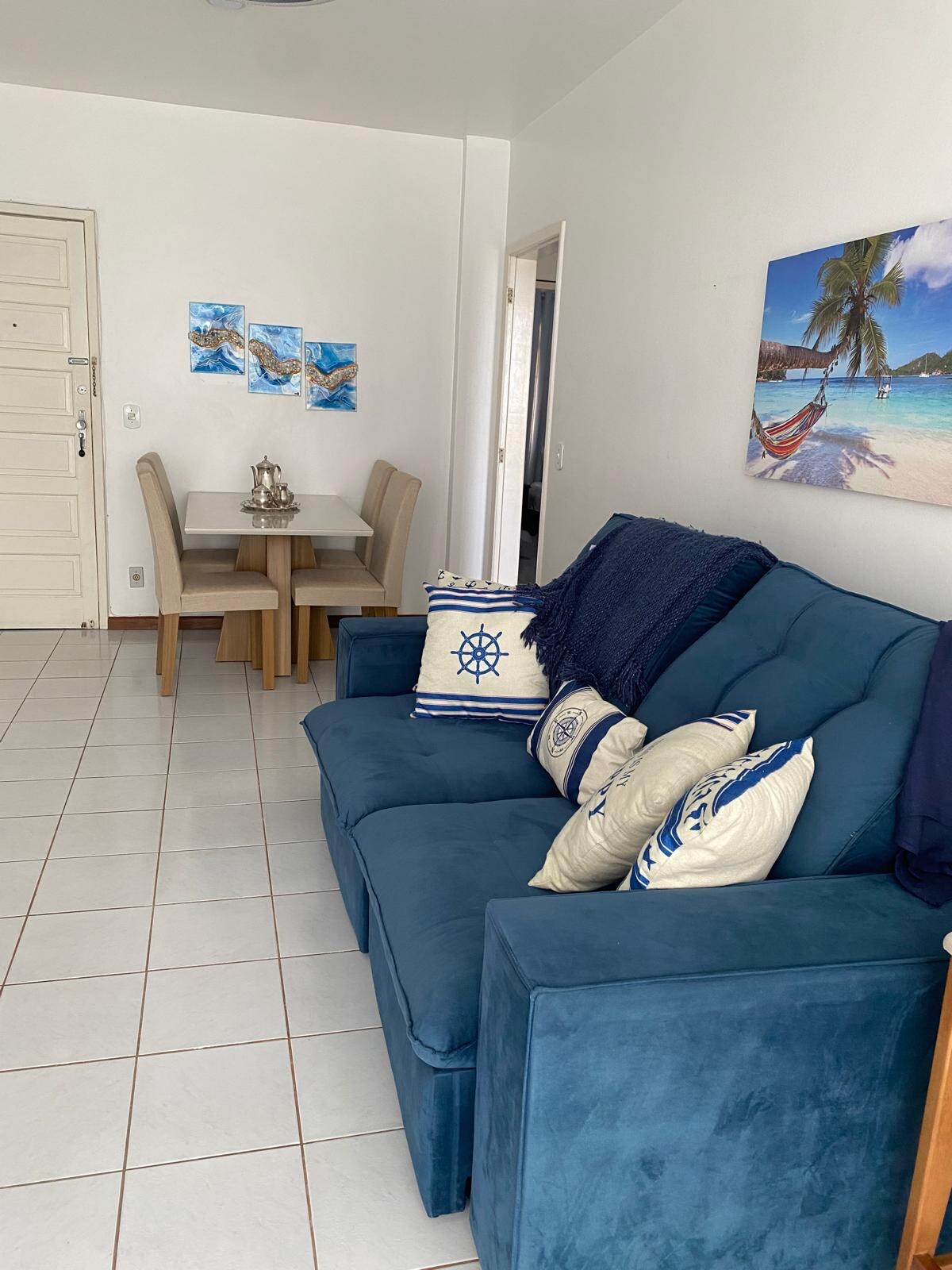 Appartement met twee slaapkamers (01 suite), tegenover het prachtige Praia das Castanheiras en naast Praia dos Namorados, met een adembenemend uitzicht. Alle kamers hebben een tv, airco en beddengoed inbegrepen. Super goed gelegen in het hart van het centrum van Guarapari, dicht bij de meest traditionele restaurants en bars, supermarkten, ijssalons, bakkerijen en andere gemakken. Garanta de beste locatie Guarapari! Er zijn 2 matrassen voor + 2 gasten, in totaal 6 personen.