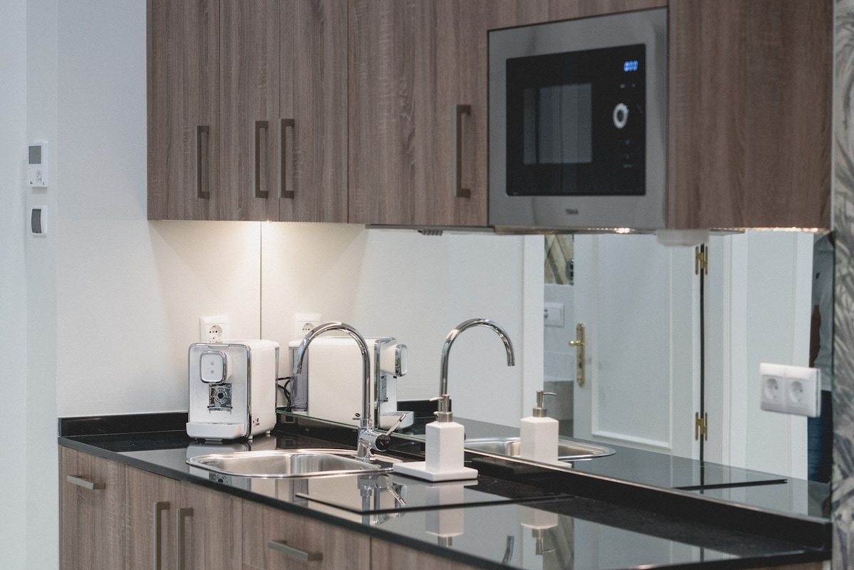 Luxe studio met slaapbank en uitzicht op de tuinen van Casa Pilatos, een van de meest bezochte monumenten in de stad Sevilla. Gloednieuw, gloednieuw, prachtig ingericht en uitgerust met de beste kwaliteiten in comfort en apparatuur: tweepersoonsbed, keuken met apparaten en Nespresso koffiezetapparaat, complete badkamer met watervaldouche. In de ruime woonkamer staat een slaapbank.