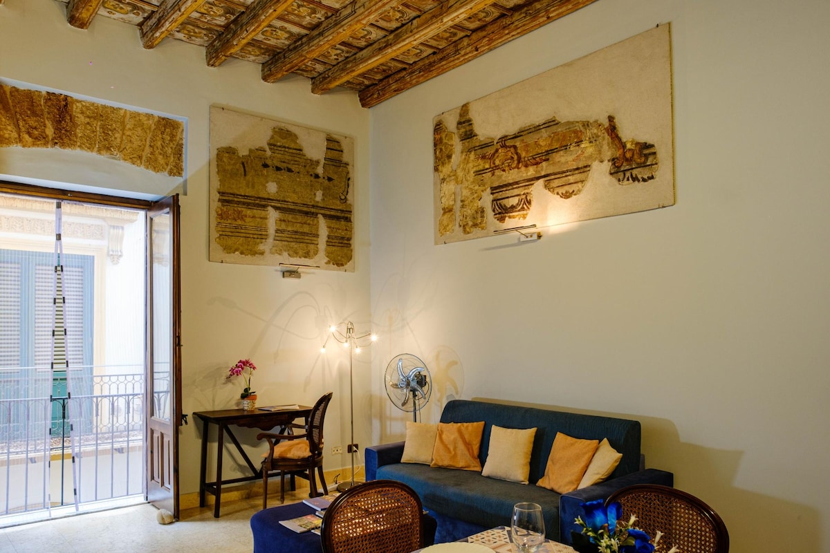 Luxe historisch appartement met fresco's in de hoofdslaapkamer in Palazzo Natoli (1765), op steenworp afstand van de kathedraal van Palermo. Twee slaapkamers (master frescoed, tweede met en-suite), twee badkamers, ruime woonkamer met balkon op Corso Vittorio Emanuele. Airco, wifi, 55 inch tv, geluiddichte ramen. Welkomstontbijtmand inbegrepen. Perfect voor stellen, gezinnen en stedentrips.