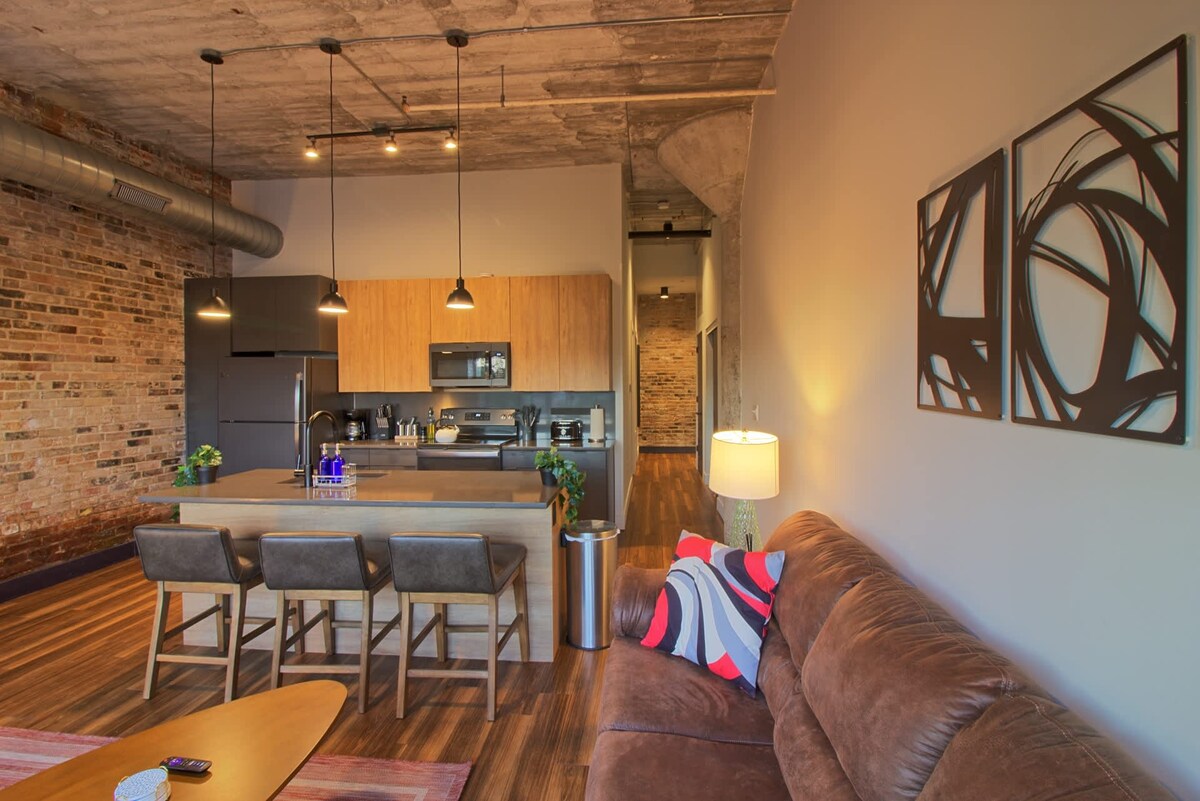 De Nash Loft is een prachtige minimalistische studio met plafonds van 12 inch, een volledig uitgeruste keuken met zwarte roestvrijapparaten en kwarts aanrechtbladen, een ruime inloopkast, een stapelbare wasmachine + droger, een designbadkamer met zwarte roestvrijstalen armaturen en frameloze glazen douche, en heldere 7 ’industriële stalen kozijnen met uitzicht op de met bomen omzoomde straat en winkels eronder. Gelegen langs de beroemde Locust Street in het hart van Midtown, ben je op een steenworp afstand van SLU, Wells Fargo, BJC en de Grove.