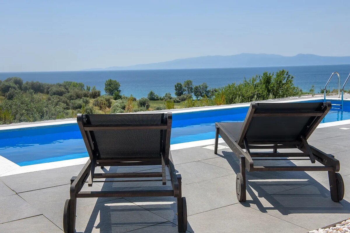 Moderne privévilla met twee slaapkamers voor maximaal zes personen, met een eigen zwembad, uitzicht op zee en de bergen en volledige airconditioning. Ideaal voor gezinnen of kleine groepen die op zoek zijn naar een rustig, comfortabel verblijf met gemakkelijke toegang tot de natuur en nabijgelegen bezienswaardigheden. Werkt seizoensgebonden van eind mei tot september.