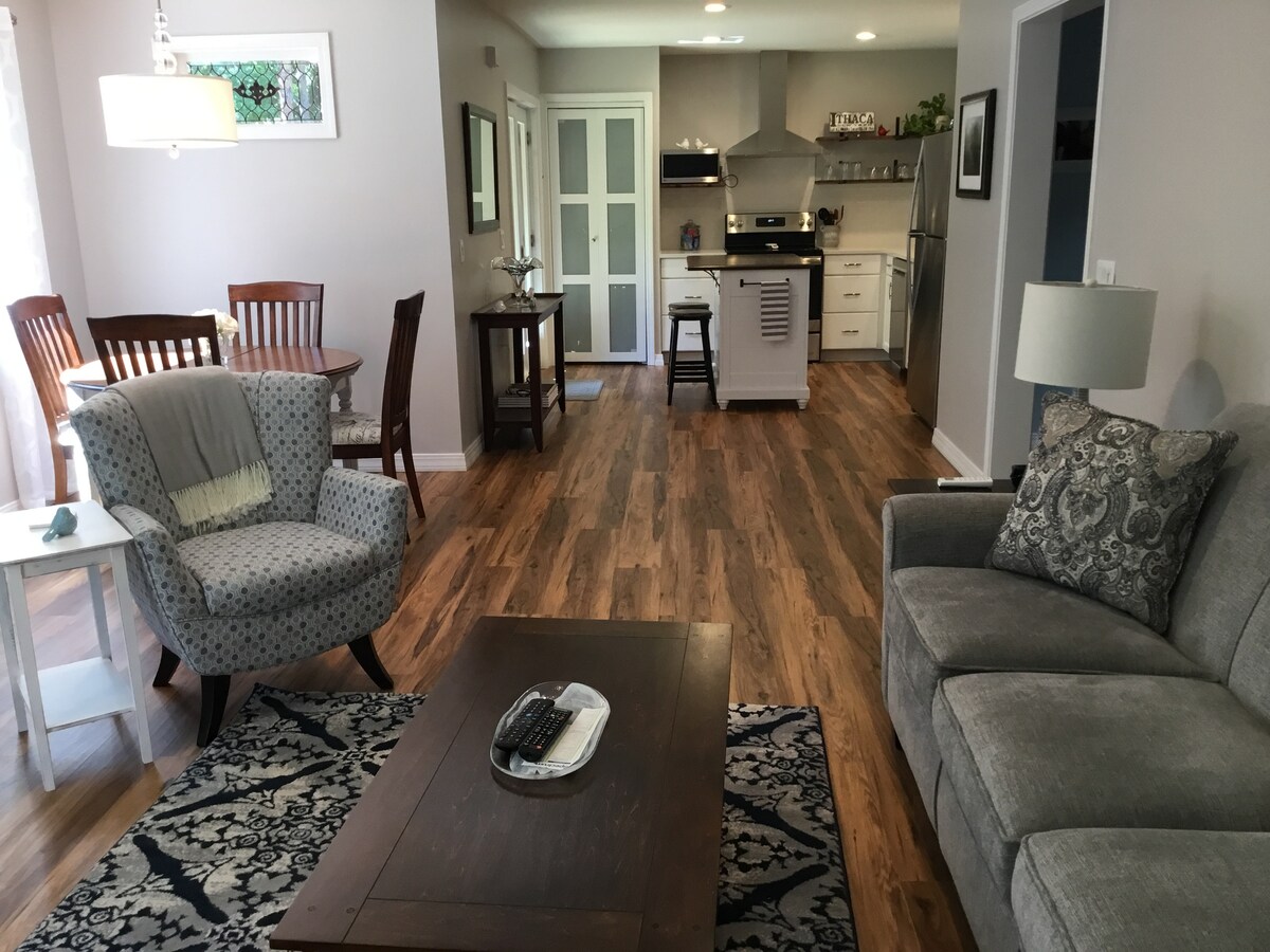 Geniet van dit moderne pension uit het midden van de vorige eeuw op een spectaculaire plek, met uitzicht op het meer, de waterval en het bos op één plek. Het huis is net volledig gerenoveerd. Dit huis ligt op slechts 3 km van het centrum van Ithaca en op 5 km van Cornell University. De locatie ligt super dicht bij alles wat Ithaca te bieden heeft - Ithaca-watervallen, het centrum, restaurants, de boerenmarkt, wijngaarden, allemaal binnen een paar minuten rijden van je huuraccommodatie. Deze unit is volledig privé, zonder gedeelde ruimtes/ingang met de andere unit.