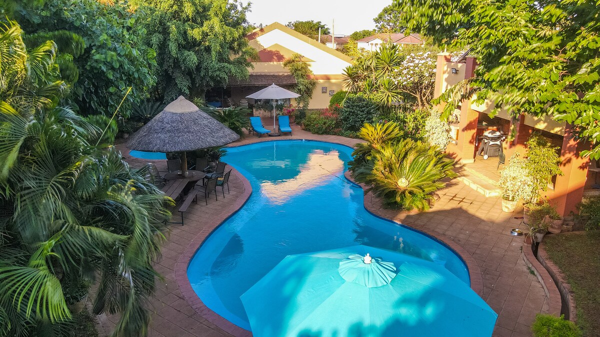 Welkom in ons gezellige Rainbow Cottage! Geniet van je verblijf met een volledig uitgeruste keuken en een eigen terras in een ruime tuin. Deze plek is perfect voor alleenreizigers, stellen en vrienden die op zoek zijn naar een gastvrij verblijf in de hoofdstad van het warme hart van Afrika! Het complex wordt 24/7 bewaakt en biedt rust en veiligheid - plus het gezelschap van onze lieve hond Ellie en ons indien gewenst :) Een café en restaurant zijn op loopafstand, voor een aantal eetgelegenheden in de buurt en de volgende supermarkt is ook niet ver