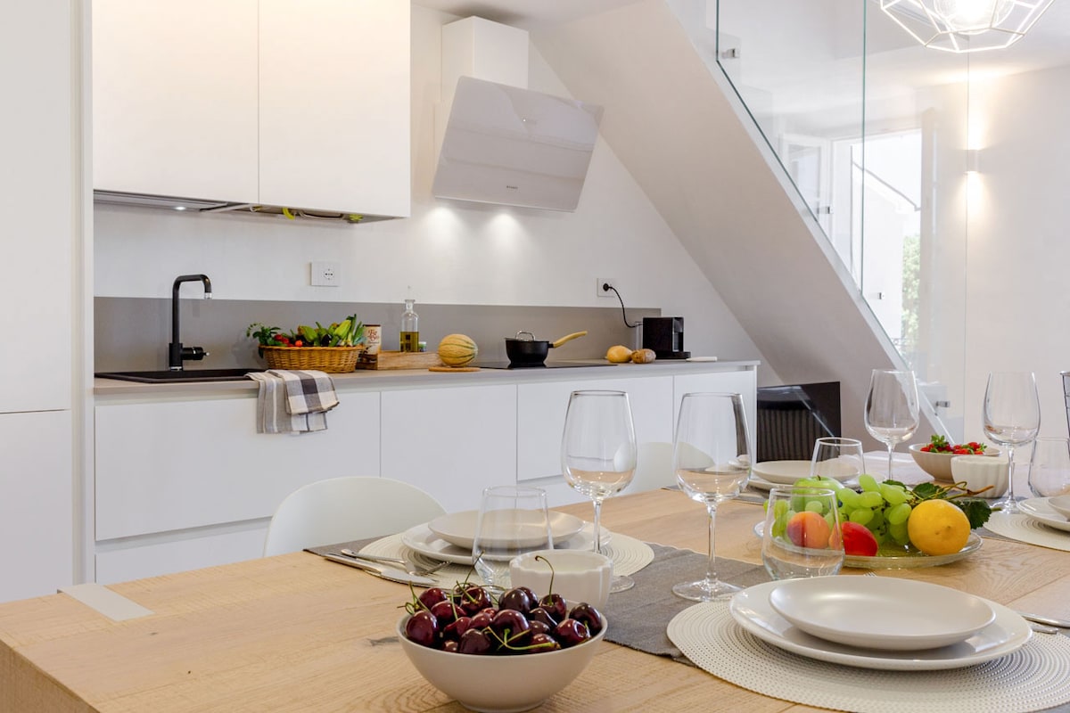 Geniet van een stijlvolle vakantie in deze ruimte ingesloten in een historisch paleis met uitzicht op het kleine plein met uitzicht op zee waar het mogelijk is op de helderste ochtenden, voorbij de blauwe horizon van de zee, om het profiel van Kroatië te zien. Het appartement is verdeeld over twee verdiepingen. de ingang, keuken en woonkamer vormen een enkele omgeving verbonden door een trap naar de bovenste verdieping met twee tweepersoonsslaapkamers en de badkamer.