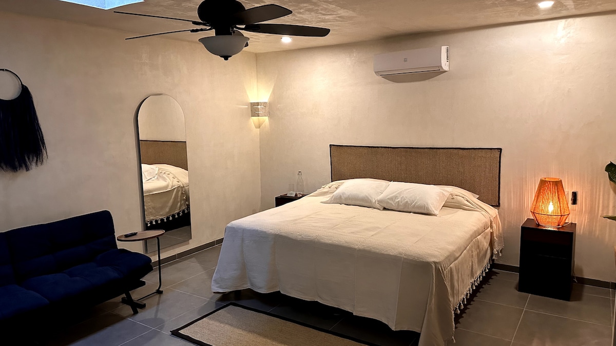 Welkom in Näab, een oase van rust en elegantie in het hart van Merida, Yucatan, waar Mexicaanse gastvrijheid samengaat met de essentie van holistisch welzijn. Geniet van onze faciliteiten, waaronder een spa, een holistisch centrum en een dak dat ideaal is om te ontspannen met de frisse lucht, naar de sterrenhemel te staren of de zonsondergang van Yucatec te bewonderen." De kamer heeft een kingsize bed, een eenpersoonsslaapbank, minibar, tv, airconditioning.
