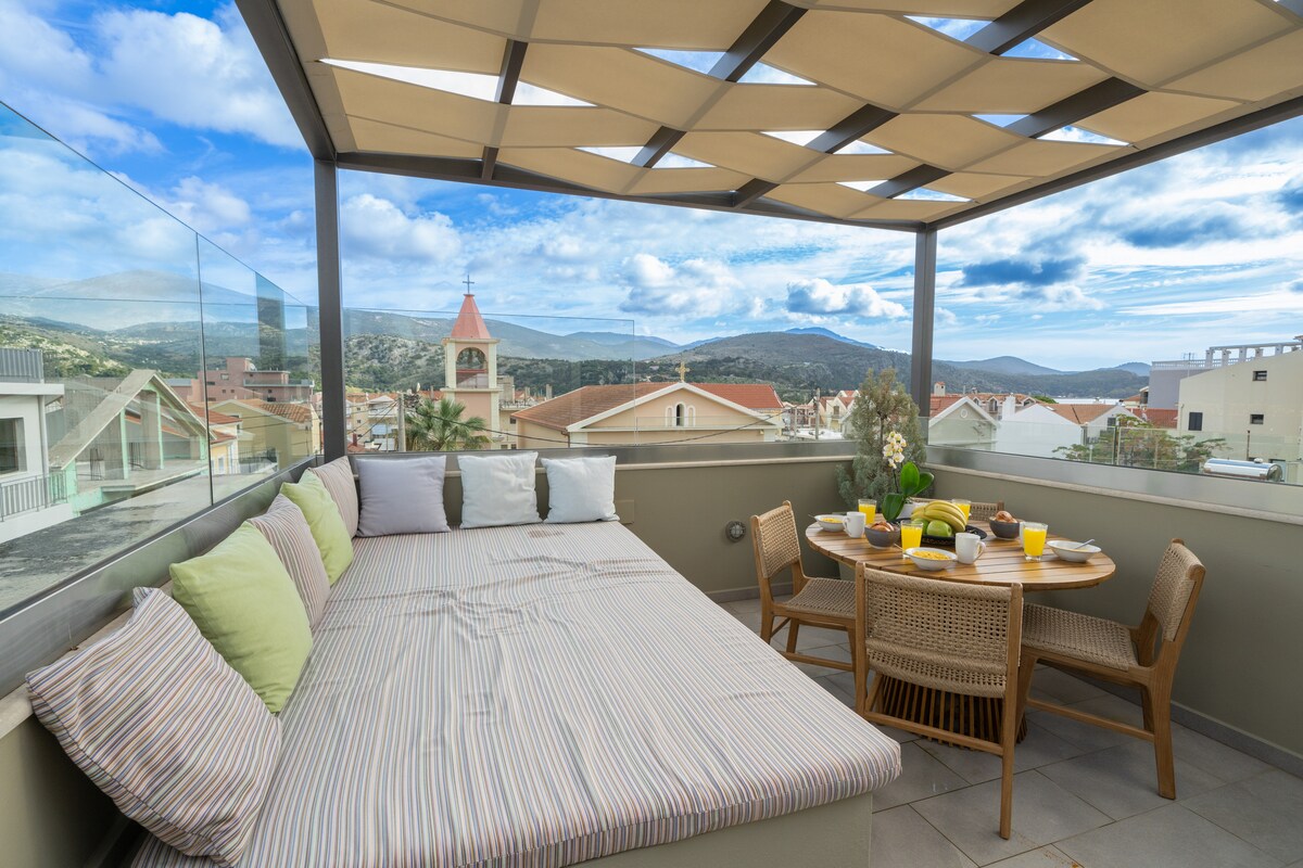 Libro D’oro is a luxurious penthouse occupying the entire top floor of a neoclassical building near Argostoli’s main square and port. It features 2 double bedrooms with en-suite bathrooms, Italian-design kitchen, vaulted wooden ceilings, and an open terrace with city views. Staying here is a romantic experience filled with elegance and charm.