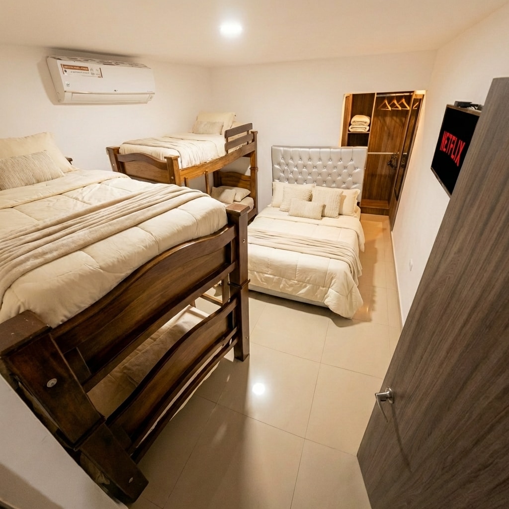 Increíble ubicación en el corazón del Novalito, Oasis en medio de la mejor zona de Valledupar. A pocos pasos a pie de todo. Piscina exclusiva en zona común para huéspedes. Wifi veloz, SmartTV, cocina equipada y lavadora digital y Parqueadero. A menos de 20 minutos del Aeropuerto. Solicitame una opción de camas por cada una de las 2 habitaciones: A. 1 Cama King B. 2 Camas Sencillas (Twin) C. 1 Cama King + 2 Camas sencillas D. 4 Camas Sencillas Ofrecemos Habitaciones adicionales si lo deseas