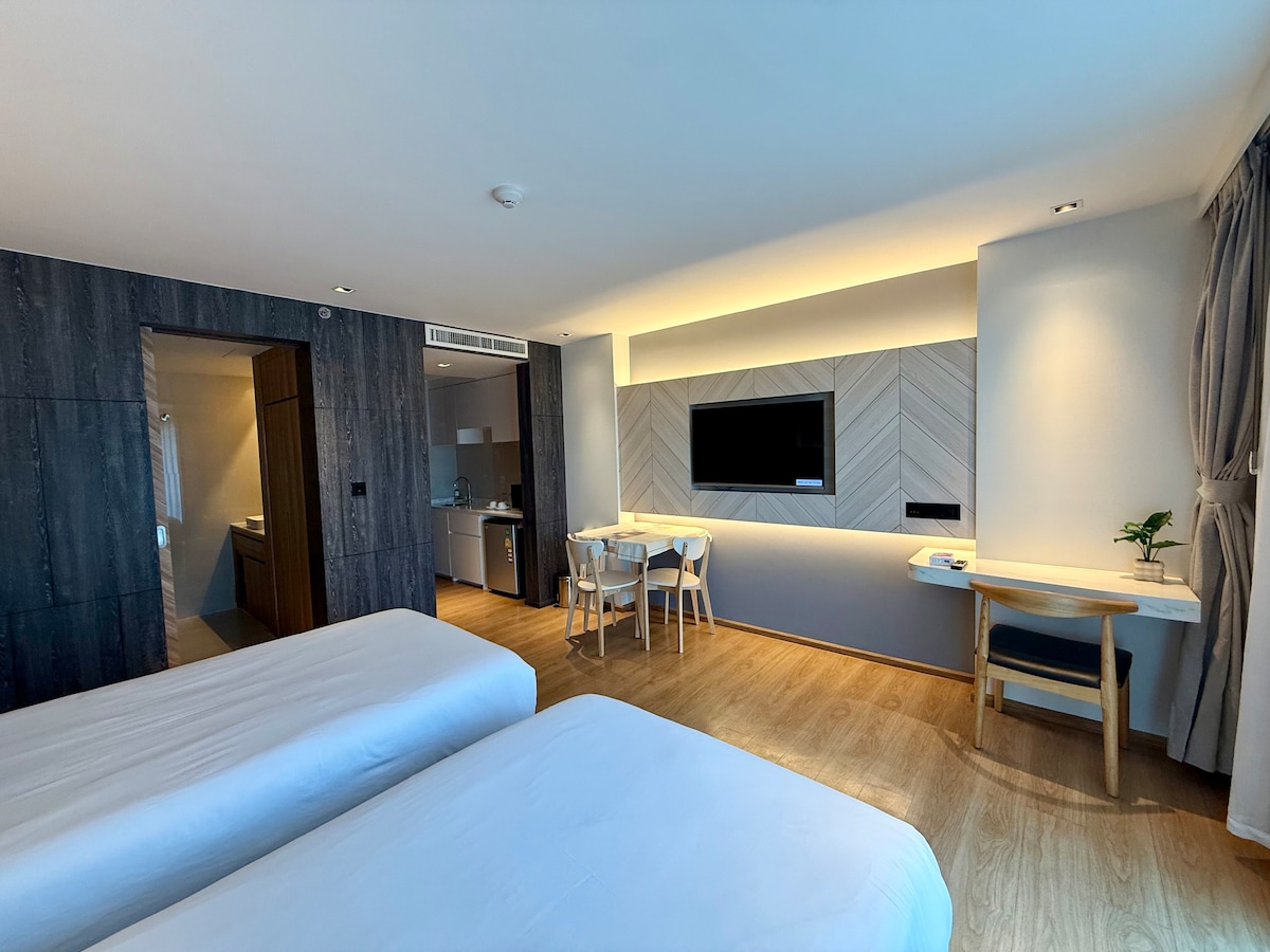 ✨ Hoogtepunten van de ruimte ✨ · Efficiënt en slim ruimteontwerp: de open indeling zorgt ervoor dat de ruimte vol aanvoelt en het zorgvuldig geselecteerde meubilair en de faciliteiten bereiken alle functies van comfortabel slapen, informeel dineren en eenvoudig koken in een beperkt gebied. · Toplocatie: · 5-8 minuten lopen naar het rustige Rawai Beach, geniet op elk moment van de zee en de zon. · 5 minuten lopen naar de levendige Rawai Seafood Market en lokale markt, van de eettafel tot het puntje van je tong, ervaar de meest authentieke smaak. · Gemakkelijke toegang tot Promthep Cape en Yanui Beach, de perfecte uitvalsbasis om het zuiden van Phuket te verkennen. · Complete resortfaciliteiten: je zult genieten van de volledige hoogwaardige buurtfaciliteiten, waaronder het iconische zwembad, de fitnessruimte en 24-uursbeveiliging.Het appartement is uitgerust met snelle wifi, smart-tv, airconditioning en een minikeuken. 🛏 Indeling en faciliteiten van het appartement · Slaapgedeelte: uitgerust met een comfortabel queensize bed met hoogwaardig beddengoed om ervoor te zorgen dat je een goede nachtrust hebt met de zachte zeebries. · Loungeruimte: er is een kleine bank of loungestoel met uitzicht op de smart, een hoek om te ontspannen. · Eet-/keukenruimte: compact maar volledig functioneel, met een kleine koelkast, magnetron, inductiekookplaat, waterkoker, basis keukengerei en servies om aan je behoeften voor ontbijt, lichte maaltijden of het bereiden van zeevruchten te voldoen. · Badkamer: aparte natte en droge badkamers met warme douche, haardroger en basis toiletartikelen.