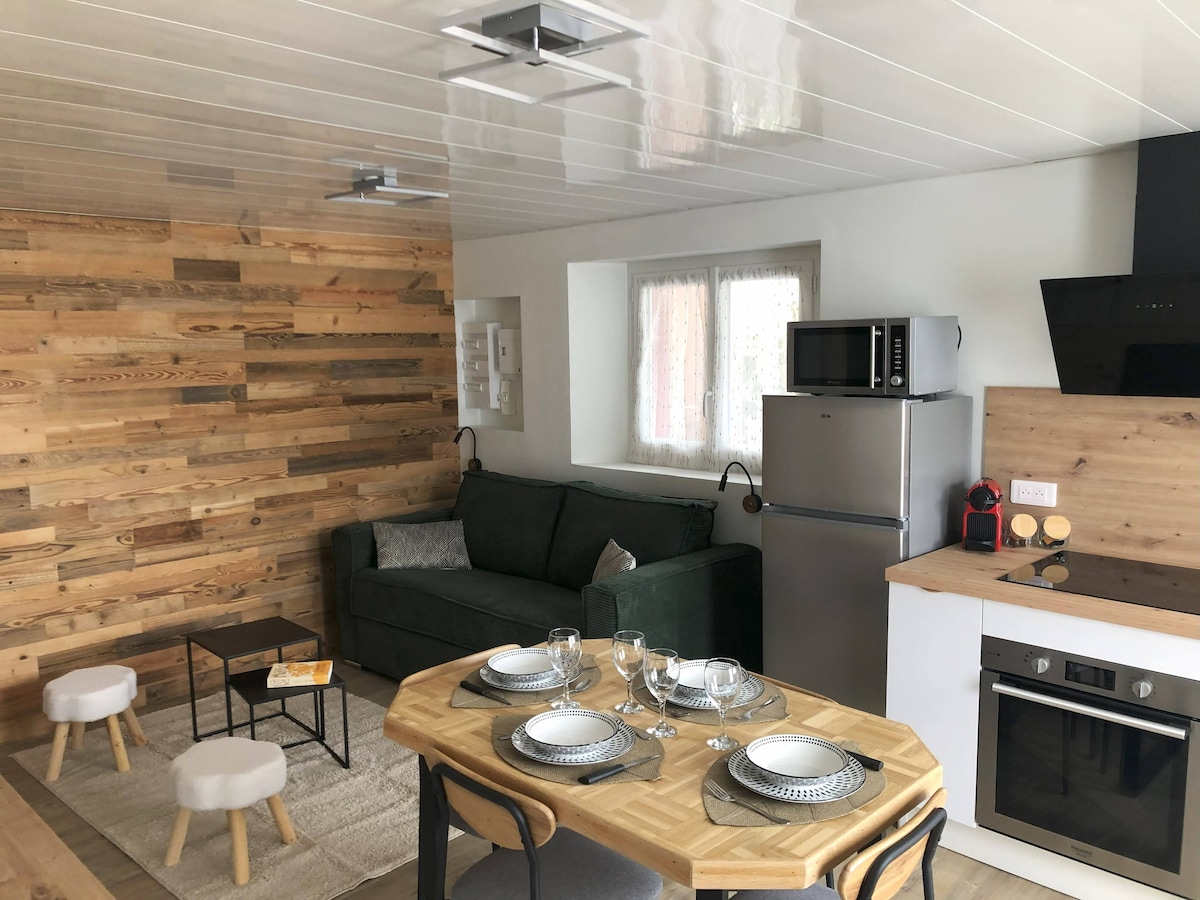 Klein atypisch huisje, uniek en vol charme net boven het stadscentrum van Mont Dore, bereikbaar via een oplopend pad van ongeveer 80 m. Het gevoel ondergedompeld te zijn in de natuur, met een prachtig uitzicht op de Capucin-berg... terwijl je op minder dan vijf minuten lopen bent van het stadscentrum, thermale baden, terrassen, winkels... Het heeft een uitgeruste keuken met toegang tot een woonkamer met slaapbank, een badkamer en een slaapkamer. Huishoudelijk, beddengoed en handdoeken zijn inbegrepen.
