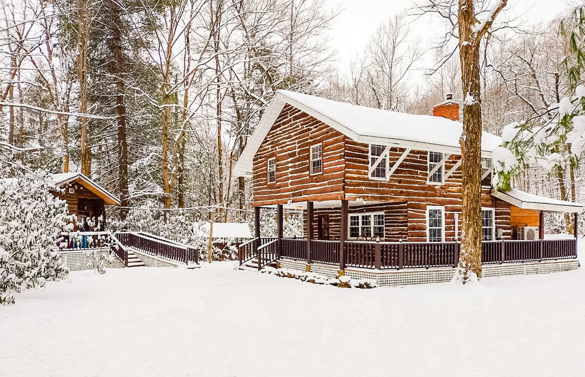 This cozy log cabin is conveniently located near Seven Springs, Hidden Valley, Ohiopyle State Park & Fallingwater. The log cabin is situated on a quiet lane along Poplar Run. Features: 3 bedrooms, 2 bathrooms, spacious living room, large kitchen, deck, outdoor seating, fire pit, pond. Guest house available April - Oct for additional fee. Inquire if interested. It features a queen bed, kitchenette & 1 bathroom. We offer Netflix & WiFi | NO Cable Dogs allowed for a $75.00 fee