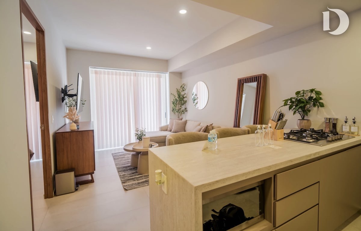 Zeer ruime woning met twee slaapkamers (kingsize en queensize bed), airco, slimme lichten, elektrische gordijnen, snelle internet wifi, overloopzwembad, loungeruimte, daktuin en alles wat je nodig hebt voor een verblijf van een dag of vele maanden. De toren heeft een winkelgebied, eersteklas restaurants en ligt op loopafstand van bezienswaardigheid, Andares en Acueducto winkelcentra en het Colomos-bos. We ontsmetten en schoonmaken het hele appartement. Lees de regels voordat je reserveert.