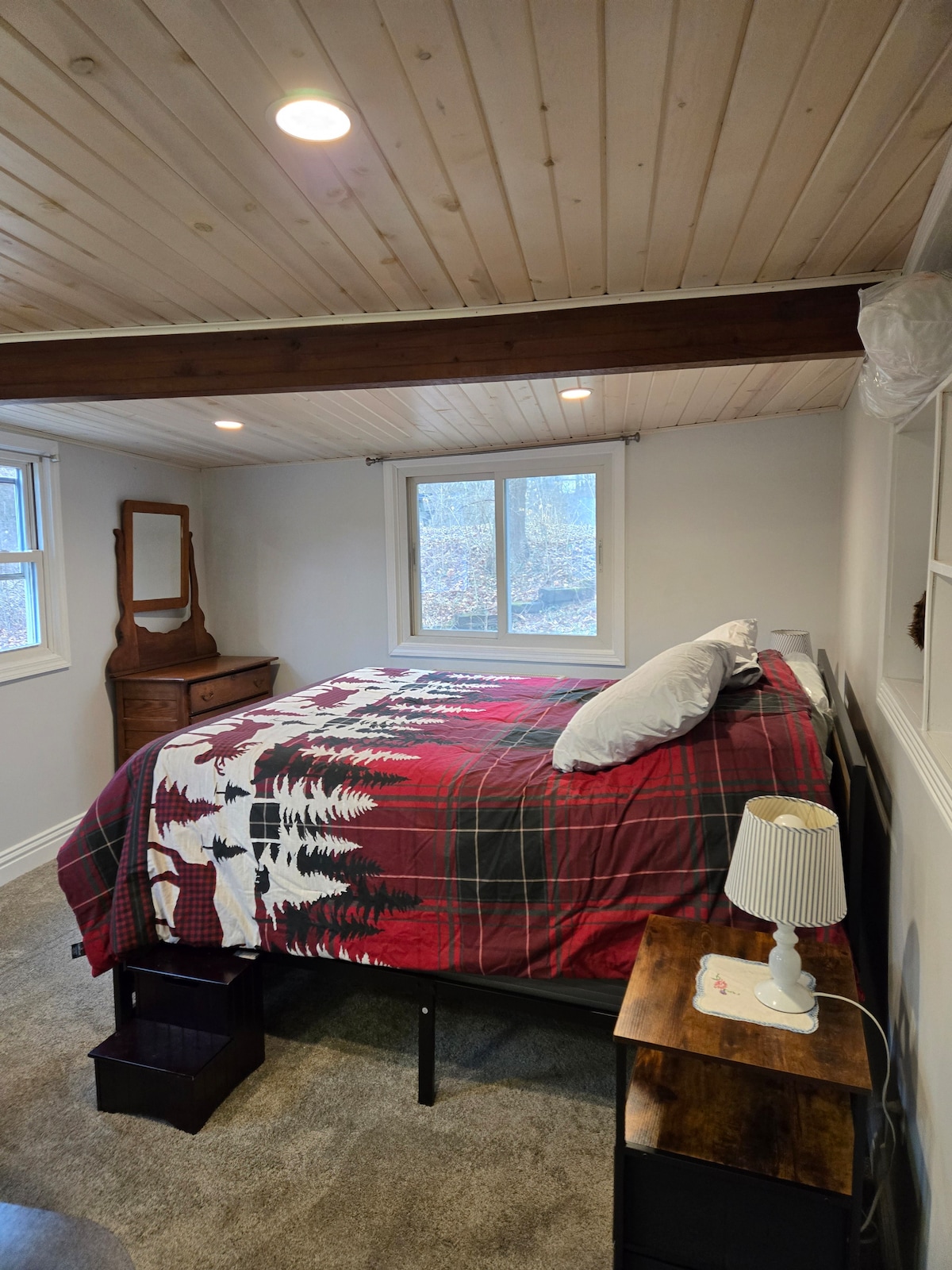 Ontspan in deze met de hand gebouwde hut aan het meer. Mooie privéomgeving, spectaculair uitzicht, kajakken, zwemmen, vissen. Dicht bij Kalamazoo en Richland, met veel opties om te dineren, wandelen, skiën, vogels kijken - of gewoon te ontspannen. Master suite met gewelfd plafond, grote inloopdouche en toegang tot het bovendek. Bad op de begane grond met diep bad. Goed uitgeruste keuken open naar eethoek en tweede woonkamer. Grote woonkamer met uitzicht op het meer, met smart-tv en geluidsinstallatie. Lagere verdieping 2e slaapkamer.