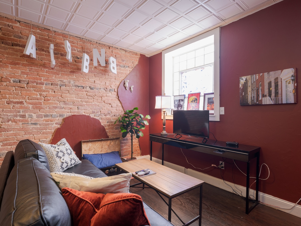 "Art is Everywhere" - Most walkable part of Baltimore - Surrounded by art and cultural sites - Hosts with local insider tips Transportation: - 5-min walk Restaurants/Bars - 5-min walk Boutiques - 15-min walk - Inner Harbor/National Aquarium - 25 min (~$35 Lyft/Uber) to Airport Nearby Landmarks: - Marriott Waterfront Hotel/Conference Center: 0.5 miles - Johns Hopkins Main Hospital: 1.2 miles - Convention Center: 1.3 miles - Penn Station: 2.6 miles