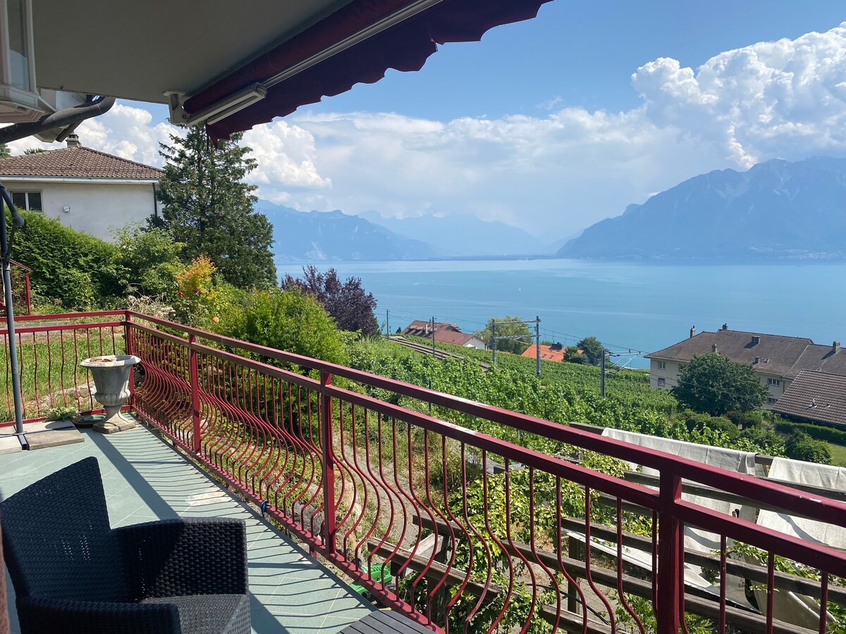Een bevoorrechte plek met 180 graden uitzicht op de wijngaarden, het meer en de bergen Nieuw appartement, groot terras met uitzicht op het meer, Veel karakter, oud hout, natuurstenen, inloopdouche, haardroger, kitchenette, met gootsteen, koelkast, waterkoker, thee, koffie, magnetron, oven, 1 elektrische kookplaat, twee potten , borden etc. Kluisje, led-tv etc... Minibar, wijnen uit de regio! Gratis openbaar vervoer (trein) van Lausanne naar Montreux! Privé en gratis park voor het huis!