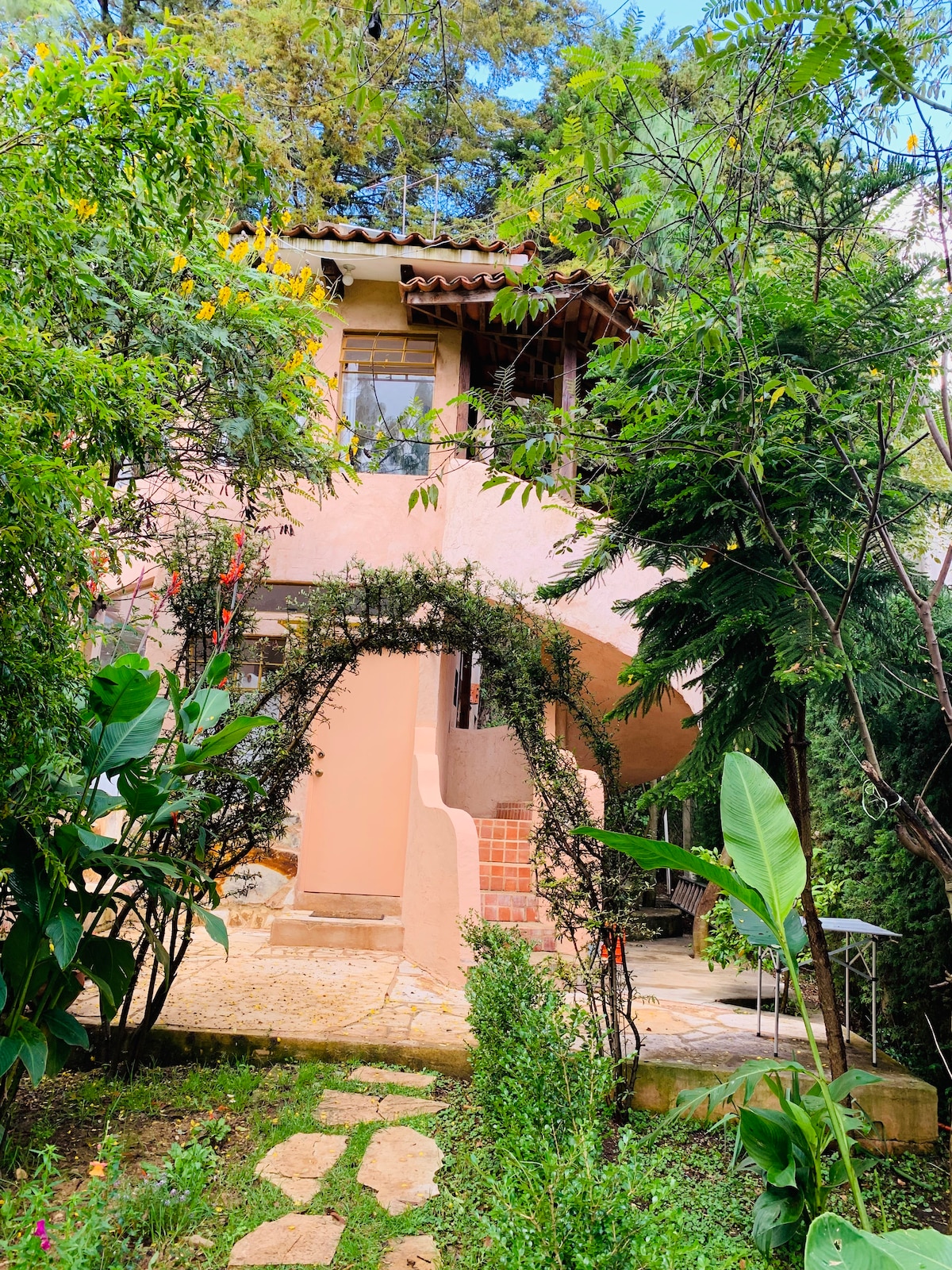 Ruim appartement met twee verdiepingen op slechts vijf blokken van de drukke Calle Real de Guadalupe. Het is gelegen op een zeer veilige woning met uitzicht op een prachtige tuin. Het heeft 1 kingsize bed, 1 tweepersoonsbed, tv-kamer, badkamer met kleedkamer, uitgeruste keuken, woonkamer met open haard, snelle wifi-internet en een comfortabel kantoor. Terras met tafel, stoelen en hangmat. Het heeft ook een wasmachine en droger op het terrein voor gebruik door gasten.