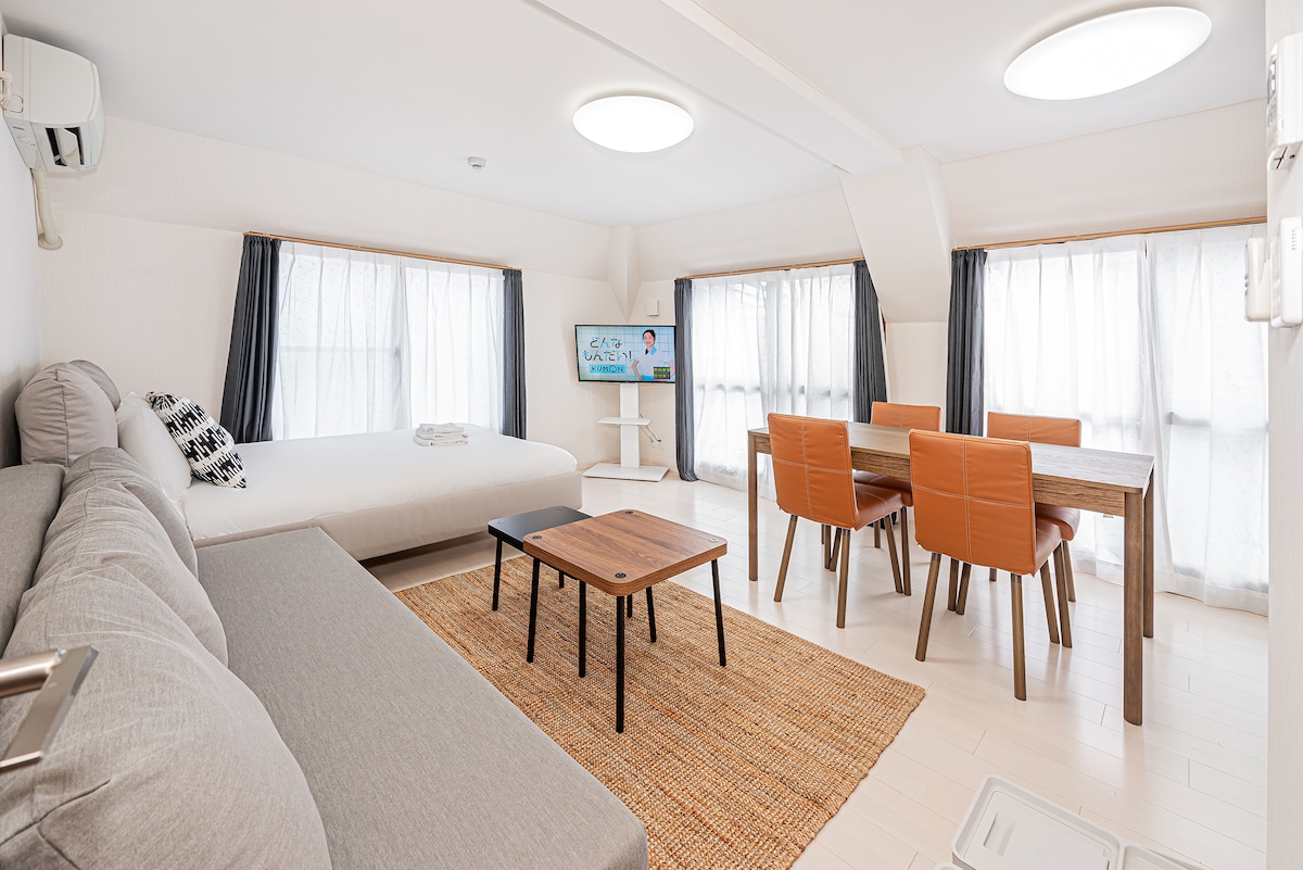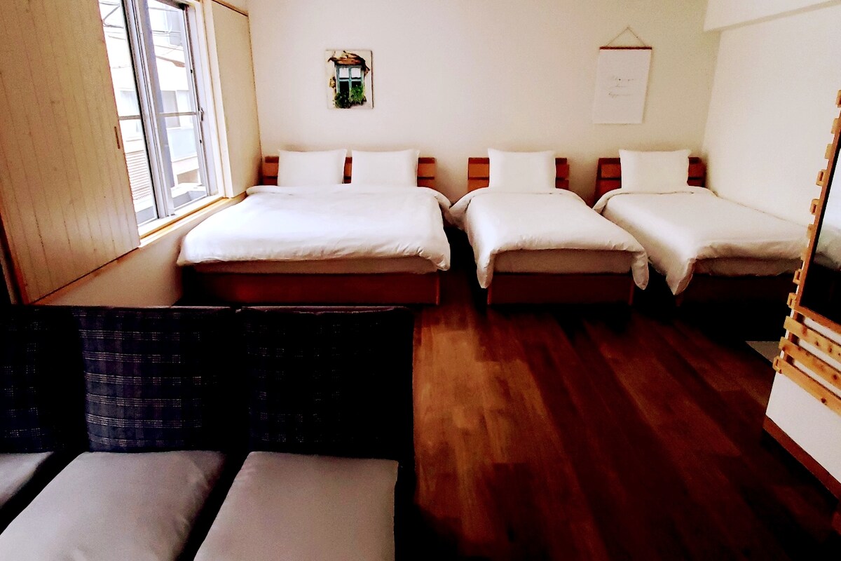 * De grootte van de kamer is 70 m ² * Vierpersoonskamer in westerse stijl met 2 standaard tweepersoonsbedden (147 x 200 cm) Muji massief houten bed * & Kamer 4 persoons kamer met 2 standaard tweepersoonsbedden (147 x 200 cm) Muji-matras * Twee enkele stoffen ringen kunnen in de open kamer worden toegevoegd (voeg 2000 yen toe voor één doek) Met een ruime keuken en een eethoek is deze kamer een geweldige plek voor een gezin om samen te komen * Toto badkamerbenodigdheden, een comfortabel bad, wastafel, wasruimte, perfect voor het nemen van een warm bad na een lange dag reizen om moe te worden, en je kunt je thuis voelen!