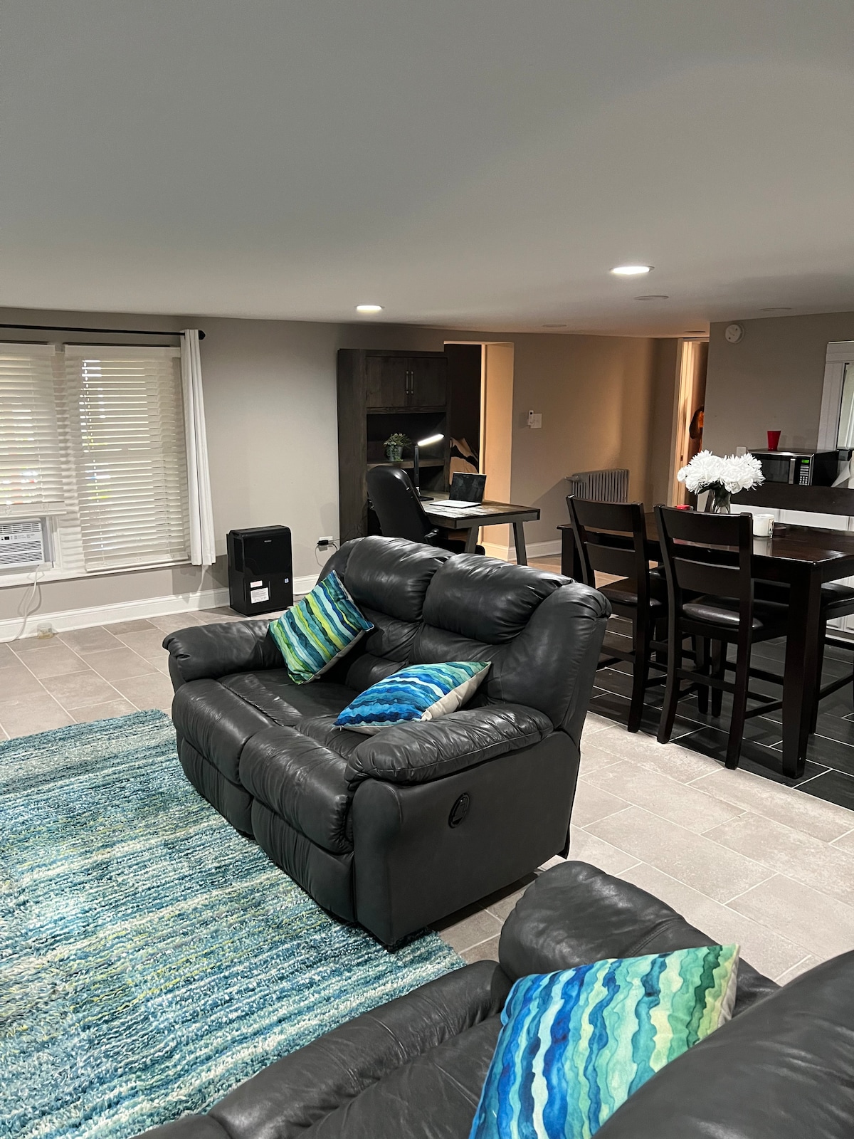 Walking distance to restaurants, stores etc. 1st floor suite will be your relaxing retreat. King size bed with a 12 inch foam mattress, down pillow/comforter set, blackout curtains will allow you a restful sleep. BR is equipped with 2 side tables, 2 dimmable touch control table lamps with 2 USB Ports. Bath offers a tub, vanity & open shelving. LR features faux leather sofa, coffee table w/the lift-top & 70” streaming TV. LR opens up to an eat in kitchen equipped with standard dine-ware.