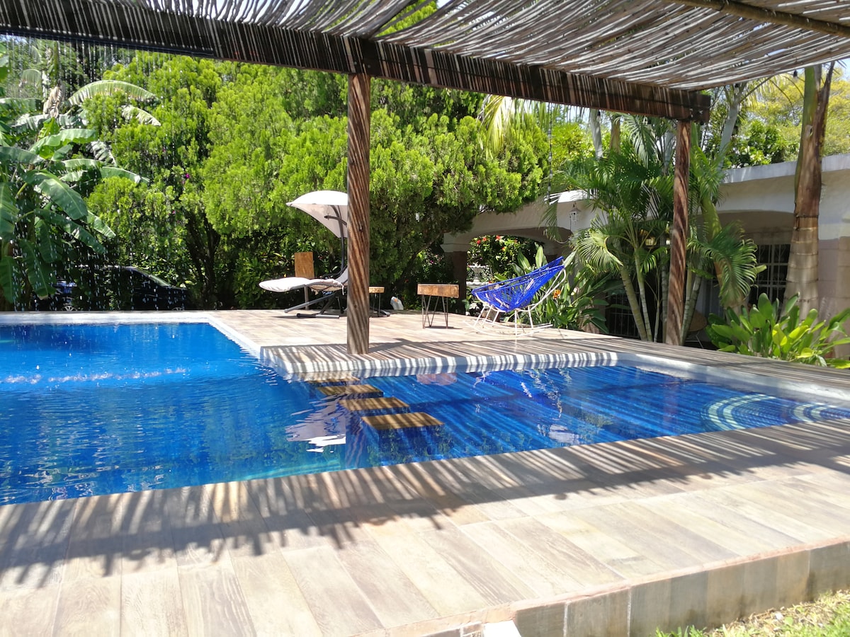 Neem het hele gezin mee naar deze fantastische plek met veel gebieden om plezier te hebben. "Nechicalli", huis met 1 verdieping, met 2 slaapkamers, 2 badkamers en 1/2 badkamers, woonkamer, woonkamer, keuken, keuken, eetkamer. Het heeft wifi. De kamers hebben vloerventilatoren en muskietennet. Gelegen in een zeer rustige privé, ideaal om uit te rusten. Het beschikt over een privézwembad zonder verwarming. Het heeft een eigen jacuzzi die je tegen meerprijs van een boiler kunt gebruiken. *Moet minimaal 4 uur van tevoren worden aangevraagd.