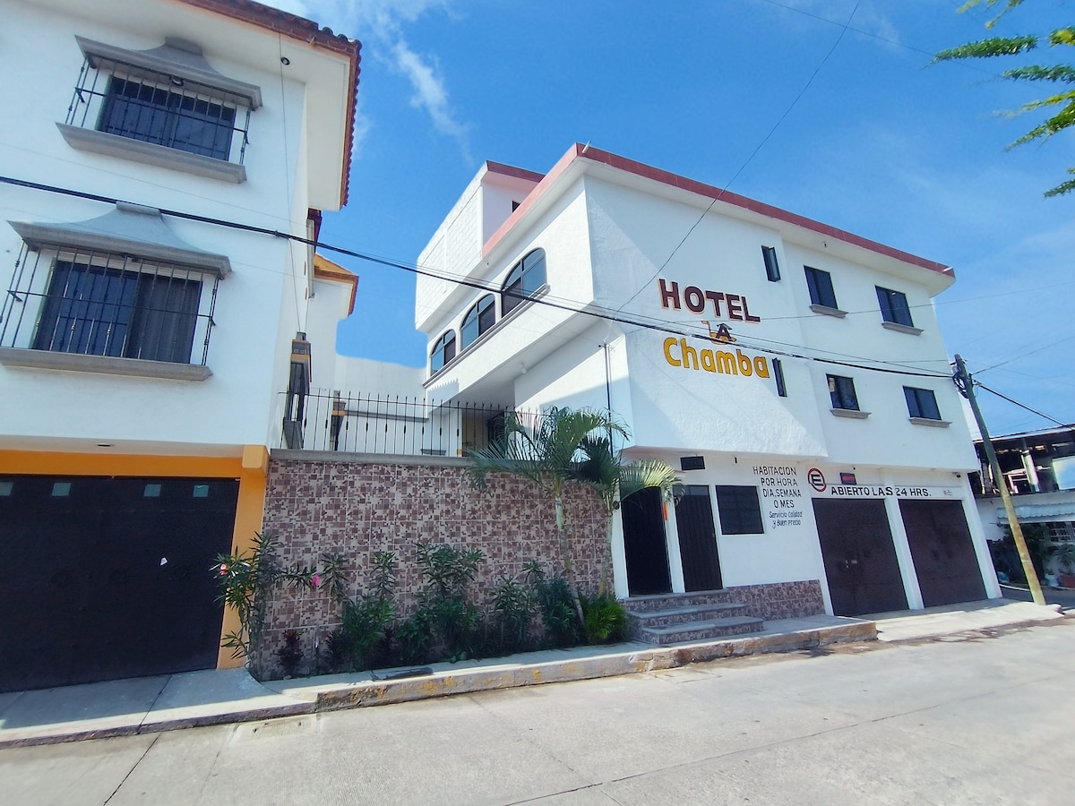 Habitación de hotel con entrada independiente cuenta con: -1 Baño completo -Agua caliente -2 toallas, jabon y shampoo -Cama king size sognare y 2 almohadas -Aire acondicionado -TV con roku -WIFI -1 Closet -1 rollo y 2 botellas de agua -Estacionamiento 1 lugar por habitación -llave de habitación y tag de acceso al portón Se entrega limpia y desinfectada. "Importante" Servicios como limpieza (para varios días), alimentos, toallas y cobijas extras no están incluidos.