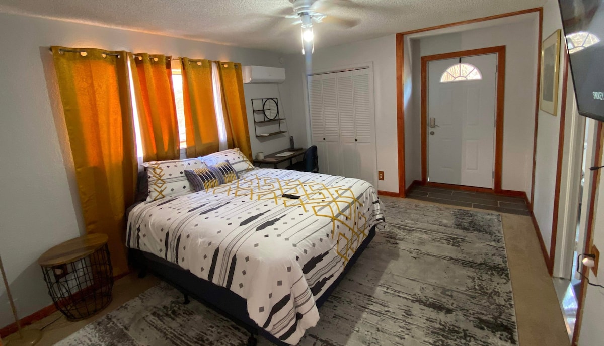 Deze stijlvolle studio ligt op enkele minuten van UTEP, verderop in de straat van Top Golf en IFly, en op slechts rijafstand van het nachtleven in het centrum van El Paso. Deze eclectische ruimte is voorzien van een eigen parkeerplaats, een queensize bed, een eigen badkamer en 1 televisie in de slaapkamer. Het ligt op loopafstand van eetgelegenheden in N. Mesa street. Mini-koelkast, koffiezetapparaat en magnetron ensuite. KUNST is te koop tegen verschillende prijzen. Gebruik de contante app of laat contant achter. *Niet ideaal voor gasten met beperkte mobiliteit *