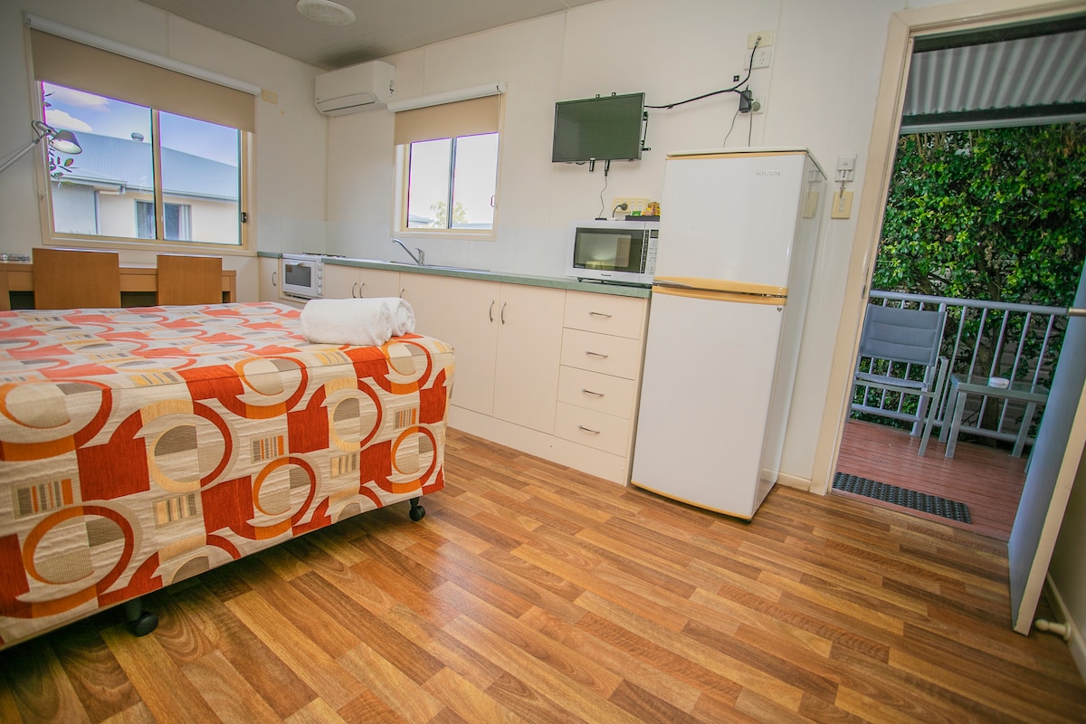The 4½ star Executive Villas are a premium motel room. The 34m2 self-contained Villa features a queen bed, ensuite, kitchen, living area with workstation, lounge (sofa bed), 42” TV, WiFi access, split air-conditioning, ceiling fan, robe, private balcony and linen. The Villas also has an iron, hair dryer and iPod dock/alarm clock, tea and coffee and bathroom amenities. The Executive Villas can accommodate a single or a couple and the sofa bed can provide accommodation for 1 or 2 children.