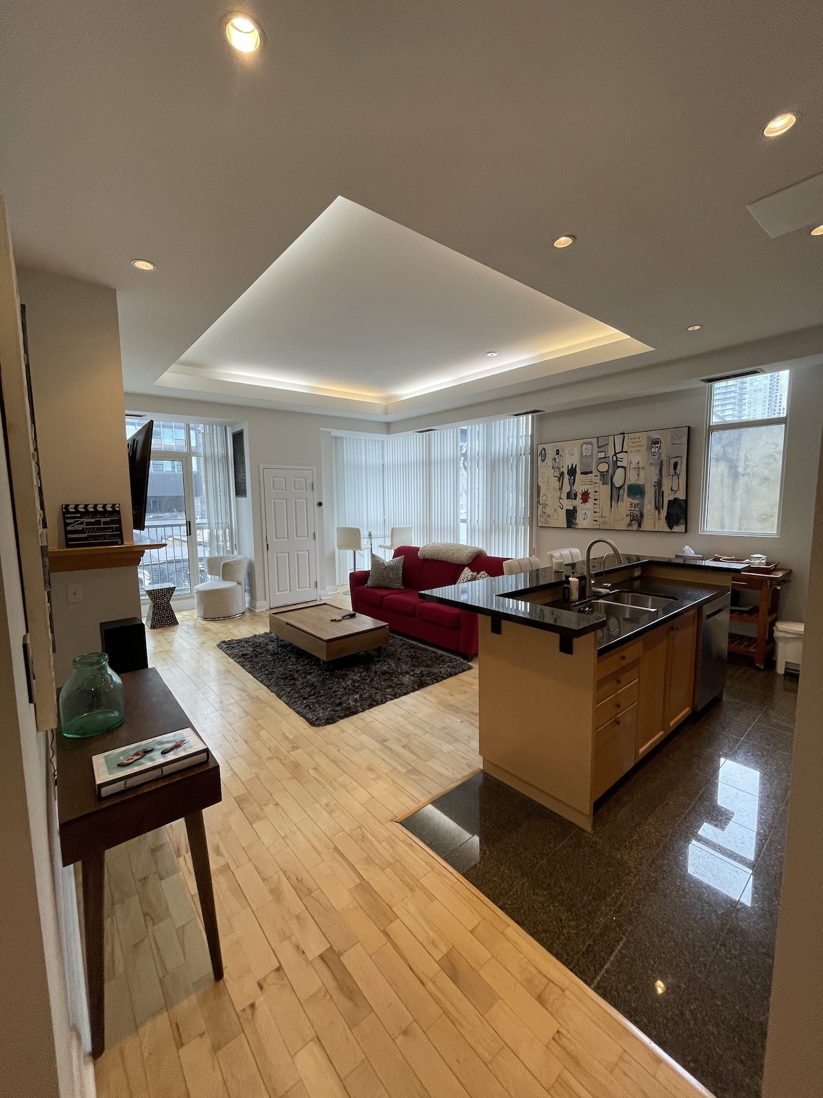 Dit unieke penthouse in het centrum van Toronto heeft plafonds van 18 voet hoog en ingericht met designmeubilair en kunst. Feestjes of harde bijeenkomsten zijn hier niet toegestaan, ze worden geannuleerd. Slechts 4 personen zijn toegestaan tot aan de unit in totaal en wordt bewaakt door 24-uurs conciërge, ze checken elke gast in en staan slechts 4 boven toe. 3 slaapkamers, een boven, alleen een bed, 1 kingsize bed en een queensize bed boven. De bank kan ook 1 ontop slapen, maar is geen bed. Vuurplaats en echte luxe kunst met een 75inch TV