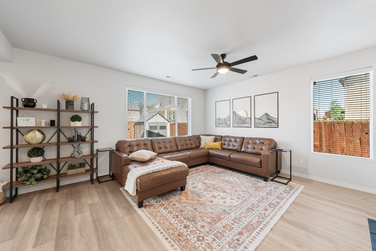 Welcome to this spacious five bedroom home designed for the whole family to spread out and enjoy Colorado life. The light-filled open floor plan invites you in, offering a large dining area and kitchen, cozy living room, game filled basement and a gorgeous master bedroom with a mountain view you won’t want to miss. Located just 15 minutes from the airport, close to restaurants and hiking trails, and only 12 miles to Garden of the Gods. Fast WiFi, central AC, great amenities and fenced backyard.