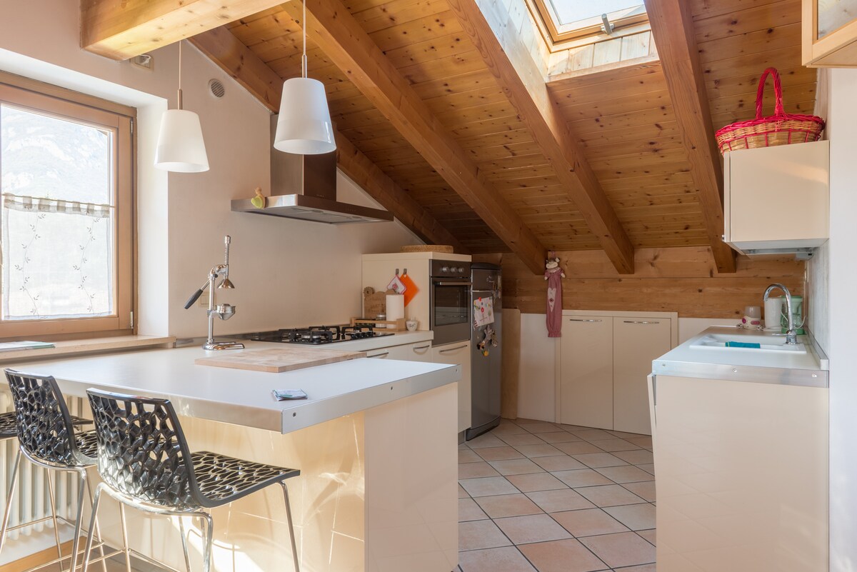 Berghuis op een hoogte van 600 meter, omgeven door kastanje- en beukenbomen. 6 km van Arco, in de buurt van het Gardameer, ideaal voor een ontspannen vakantie en thuiswerken, voor liefhebbers van wandelen, mountainbiken, klimmen en natuurwandelingen. Uitgerust met alle wooncomfort, heeft het een grote omheinde tuin (300 m ²), eigen parkeergarages en een ontspanningsruimte in de buitenlucht om's avonds samen door te brengen. Huisdieren zijn welkom. Satellietinternetsnelheid 200/250 mb/s.
