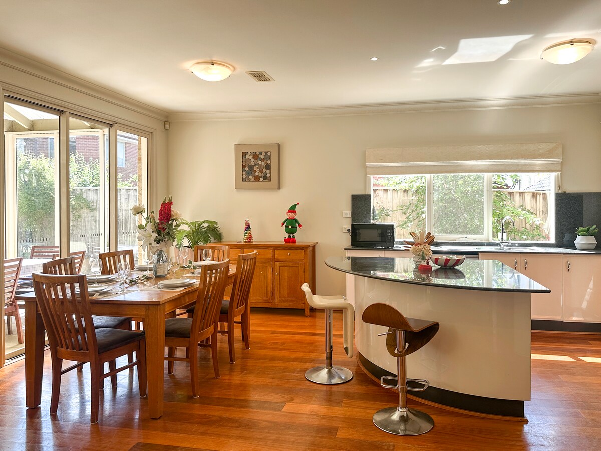 Ontspan met het hele gezin op deze rustige plek. Woning met airconditioning dicht bij Monash Uni. Heeft twee slaapkamers met queensize bedden en een extra comfortabele slaapbank. Huishoudelijke apparaten zijn gloednieuw met de koelkast met een waterfilter/ijs erin. Dicht bij populaire winkelcentra Glen/Chadstone, M-City, Mount Waverley treinstation/winkelstad. Verwarming in het hele huis. Snelle toegang tot de snelweg om in enkele minuten in de stad te komen. Gratis wifi/Netflix/Tuby. Omgeven door parken, fietspaden...