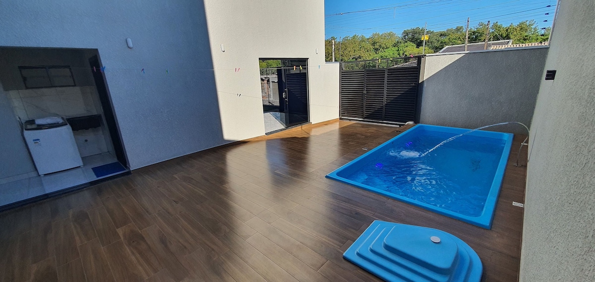 Ons huis in Foz do Iguaçu, in het Land van de Watervallen, is een plek om te rusten, te glimlachen en goede herinneringen te creëren. Het is ontworpen voor gezinnen en groepen en biedt plaats aan maximaal 13 gasten, met 4 slaapkamers, 4 badkamers en airconditioning in alle kamers. Het plezier vindt plaats in de 2 zwembaden, de barbecue, de pooltafel, de pingpongtafel en de kinderruimte. Hier is je huisdier welkom. Een garage voor vier auto's en een wasserette maken het comfort compleet.