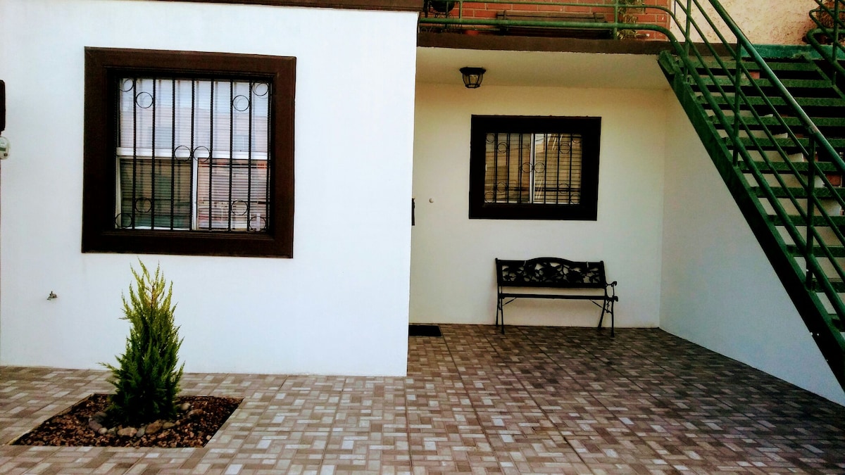 Departamento cómodo y seguro, ubicado en la zona más céntrica de la ciudad. Cuenta con todos los servicios básicos además de WI-FI, dos minisplits, cochera privada para un vehículo y área de terraza con asador. Dos habitaciones con clóset, una cama queen y dos individuales, sala con sofá y cocina equipada. Estacionamiento con portón eléctrico. A 5 minutos de plazas comerciales, 15 minutos del consulado americano y 15 minutos de puentes internacionales