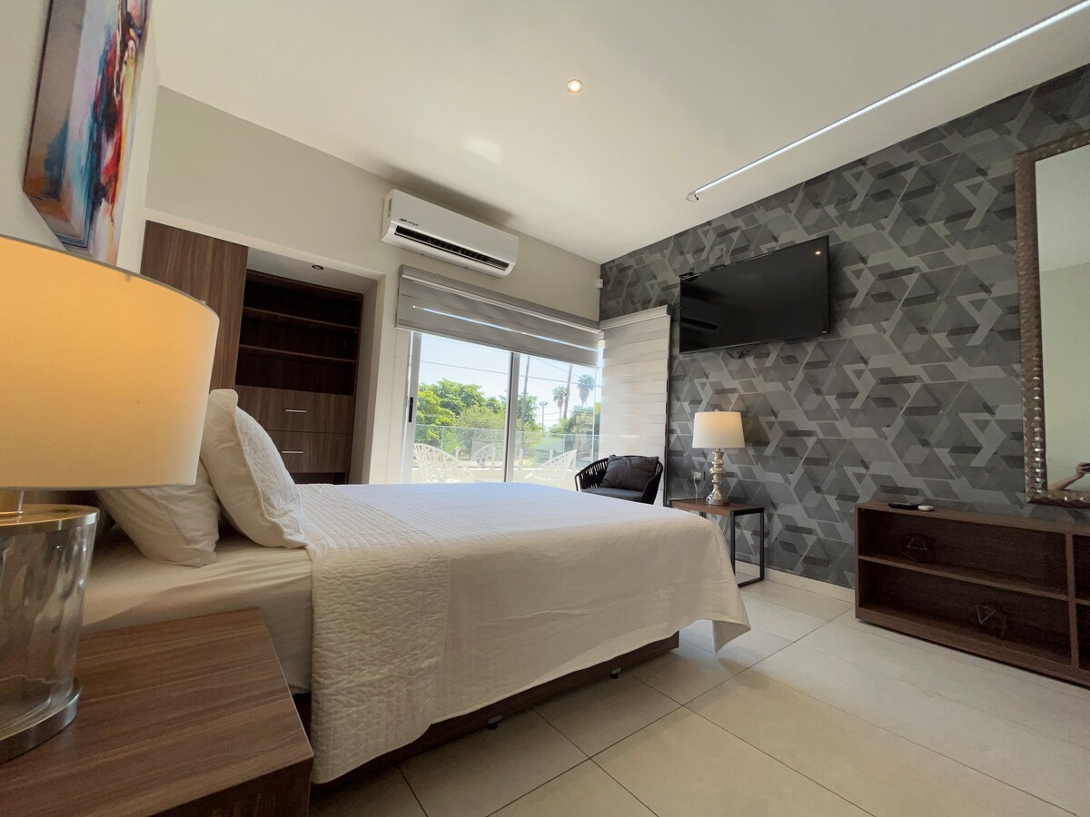 Geweldige locatie, het ligt tussen de straten Nainari en Allende. Nainari is een van de belangrijkste straten van de stad, met veel bezienswaardigheden in de buurt: IMSS, Laguna del Nainari, sportcentrum, Plaza Tutuli, cafés en nabijgelegen restaurants zoals zeevruchten, taco's, sushi, pizza, fitnessruimte, supermarkt. Onlangs gerenoveerd, gezellig en functioneel loft. Het heeft Alexa, 40 inch Roku-scherm, je hebt toegang tot het terras, wifi, parkeren voor de deur. Het is zeer veilig, het heeft een slim slot, een buitencamera en een elektrische omheining.