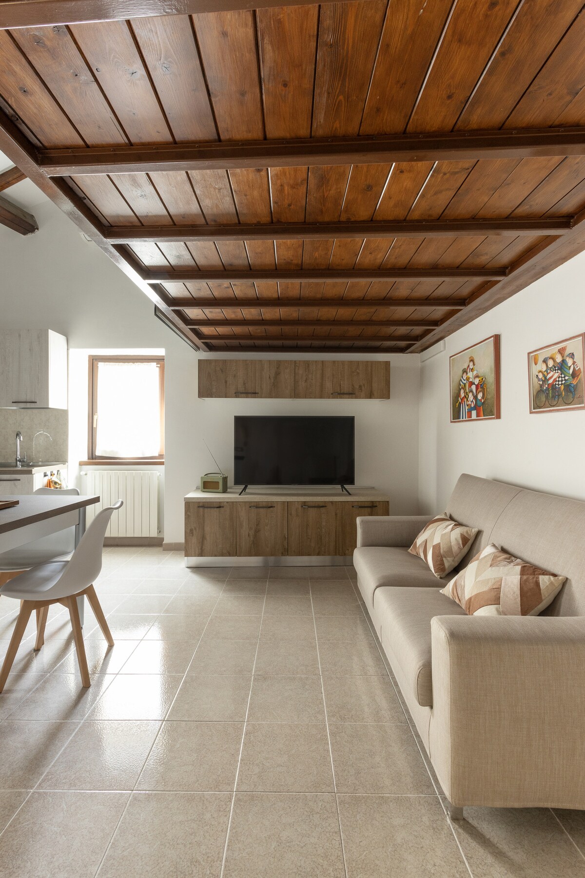Appartement met twee verdiepingen (40 vierkante meter). Op de begane grond bevindt zich een woonkamer met keuken, op de eerste verdieping bevinden zich een slaapkamer en een badkamer. Eigen buitenruimte met tuinmeubilair. Toegang tot het zwembad. 2 slaapplaatsen Het huis is omgeven door 11 hectare landbouwgrond waar we olijven en hazelnoten grove. De flat is onderdeel van een complex van vakantiehuisjes met een groot zwembad.