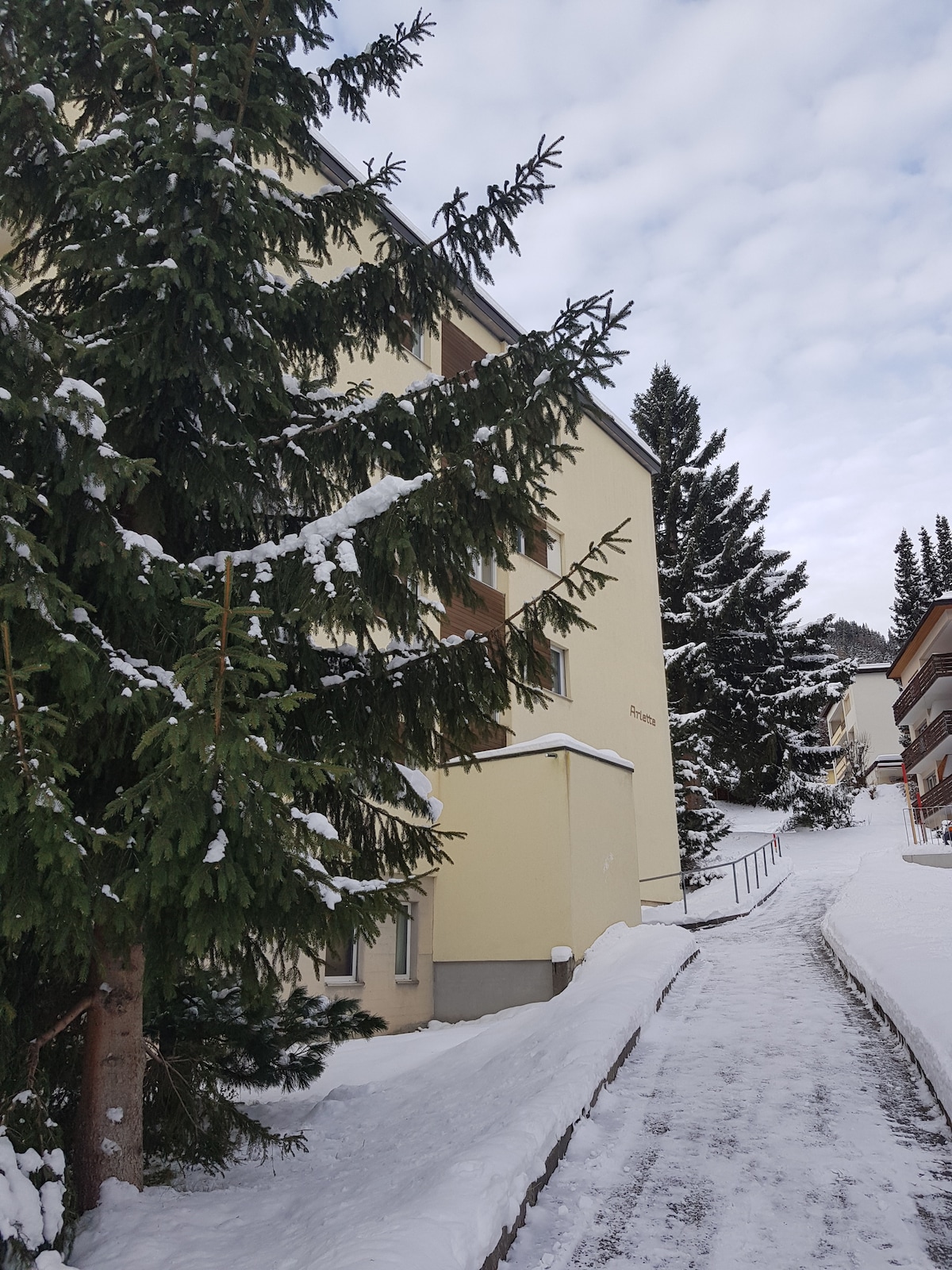 Nieuw gerenoveerd appartement met 2 slaapkamers, keuken en 2 buitenparkeerplaatsen. Het appartement ligt aan de Jakobshorn waar de skipistes zich bevinden, ook geschikt voor langlaufen. Bushalte ligt op 100 meter afstand richting station en centrum. Te voet 15 minuten. Kamer met prachtig uitzicht op de bergen, rustig gelegen.
