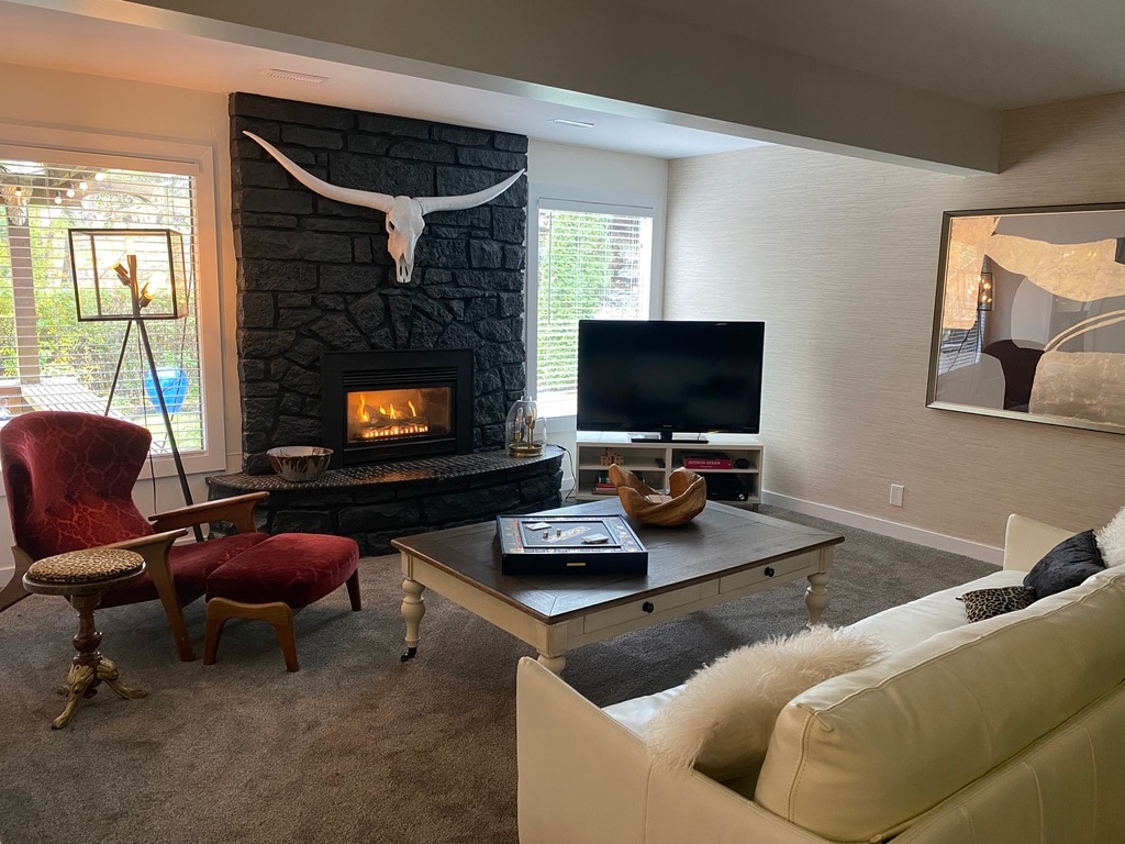Welcome to your private country retreat! This 1,800 sq ft guesthouse on 10 peaceful acres blends comfort, style, and rural charm. Enjoy a separate entrance with keyless access, an open-concept kitchen, dining and living area, plus a cozy rec/media room with a 60″ TV and fireplace. The master bath offers in-floor heating for ultimate comfort. Guests are invited to visit our friendly horses, mini donkeys, chickens, and cats for a true and memorable country experience.