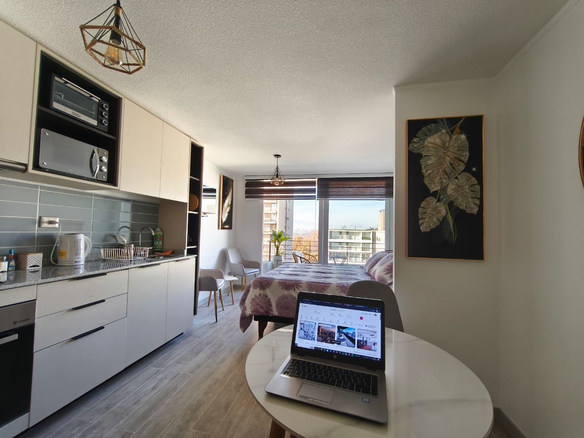 Ontdek een charmante moderne studio op een toplocatie in het centrum van Santiago, ideaal voor stellen of reizigers die op zoek zijn naar comfort en gemak. Het beschikt over een comfortabel tweepersoonsbed, een volledig uitgeruste keuken, een moderne badkamer en een gezellig terras dat perfect is om te ontspannen terwijl je geniet van het uitzicht op de stad. Op een steenworp afstand van populaire restaurants, openbaar vervoer en de belangrijkste toeristische attracties. Boek nu en beleef de beste stedelijke ervaring in Santiago!