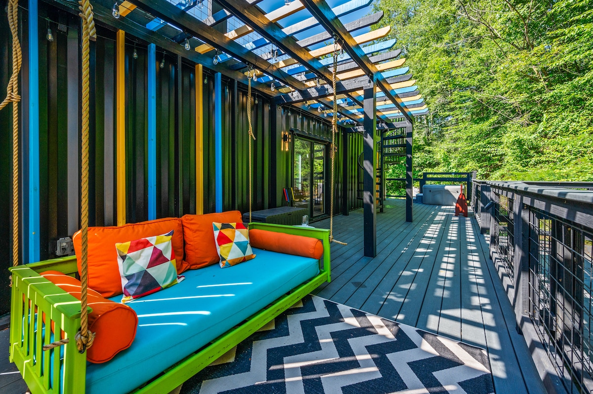 De kans is groot dat je na aankomst niet meer wilt vertrekken, dus geef niets meer uit aan je uitje! Moderne woning met 38 ramen en dakramen. Handgemaakte live edge meubels, leren bank, luxe bubbelbad, hi-speed wifi, premium kabel, 10-speaker Sonos-systeem, kleurveranderende lichten, schommelbed, vuurkorven en 1/4 mijl van trapsgewijze watervallen en een mijl van wandelpaden en wandelpaden, en ze zijn allemaal privé. Plus gratis opladen van elektrische auto's.