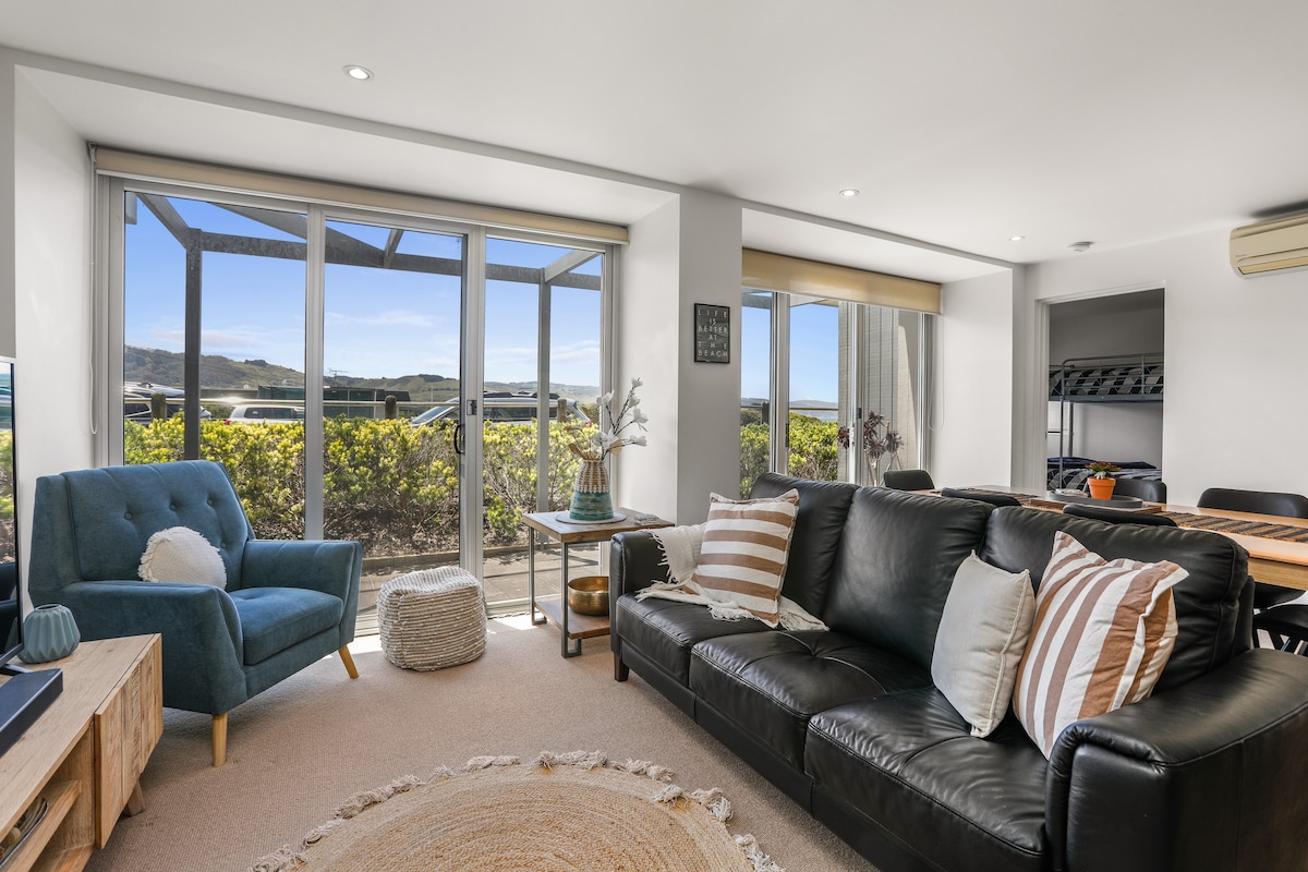 Het perfecte strand om weg te gaan voor gezinnen, koppels en vrienden - uitzicht op de oceaan vanuit de woonkamer, eetkamer , keuken en een van de slaapkamers. Geniet van gemakkelijke toegang tot alles vanuit deze perfect gelegen thuisbasis. Het strand ligt net aan de overkant van de weg - 50 m - en winkels, cafés en restaurants op loopafstand langs een geplaveid pad of strandpad.