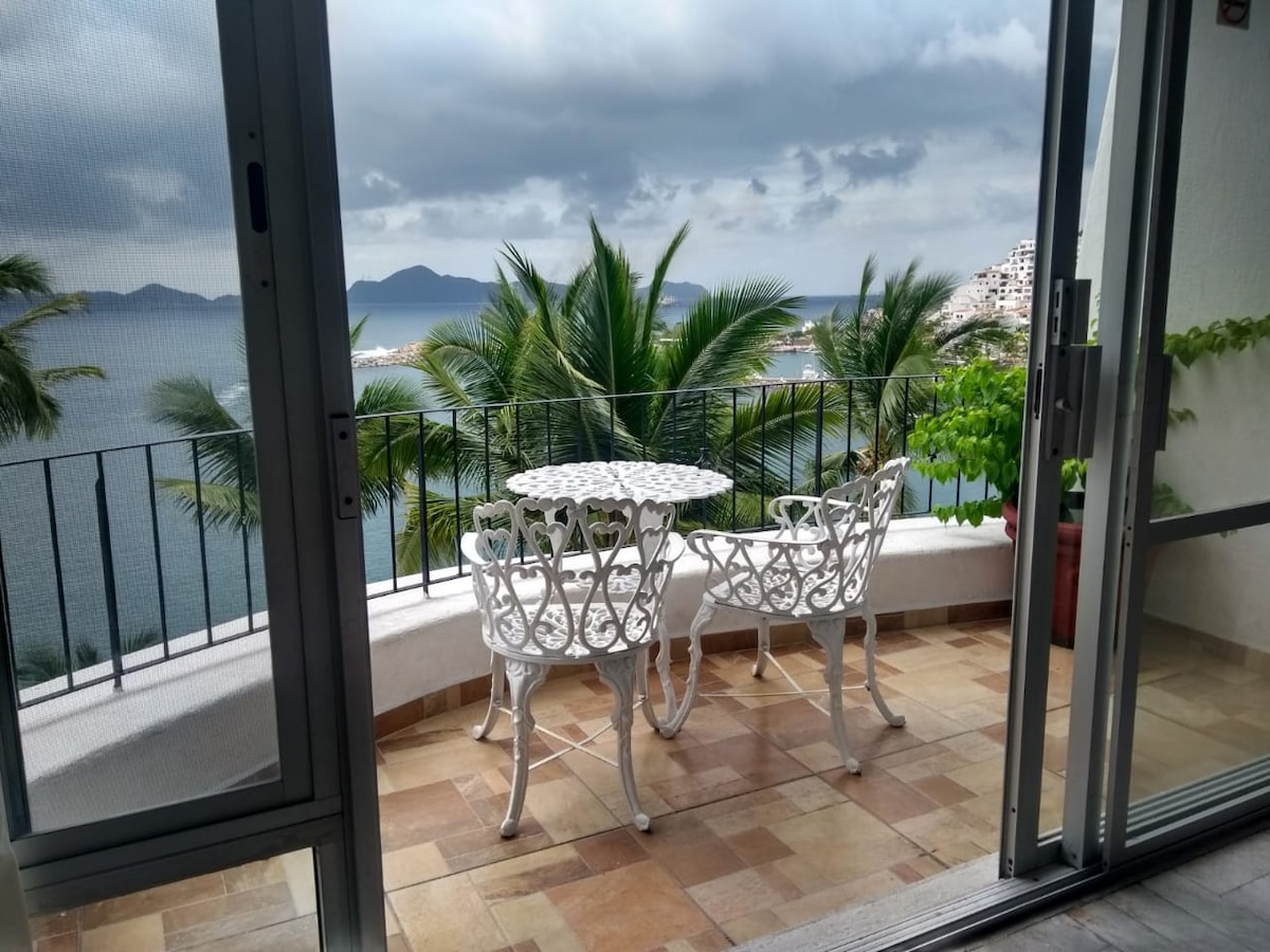 Een comfortabel appartement aan zee met een groot terras om buiten te zijn, met uitzicht op het zwembad en de zee. Het heeft een eetkamer, een badkamer, een keuken met een koelkast, een fornuis met een beveiligingsventiel met een thermostaat,een magnetron en een slaapkamer. Ga een trap af en je bent op het strand in een privéruimte met comfortabele stoelen en koele palapa schaduwen. Je kunt het gerecht koken dat je het leukst vindt in de keuken van het appartement of het restaurant vragen dat zich in hetzelfde complex bevindt dat je serveert.